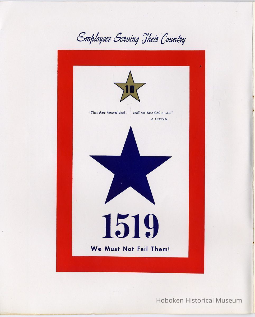 The frontis printed in blue, red and gold: Employees Serving Their Country. It has a small gold star with 10 in the center which commemorated men who had died in the line of duty so far during World War Two. A large blue star with 1519 below it indicates the total number of railroad employees who were currently serving in the armed forces.