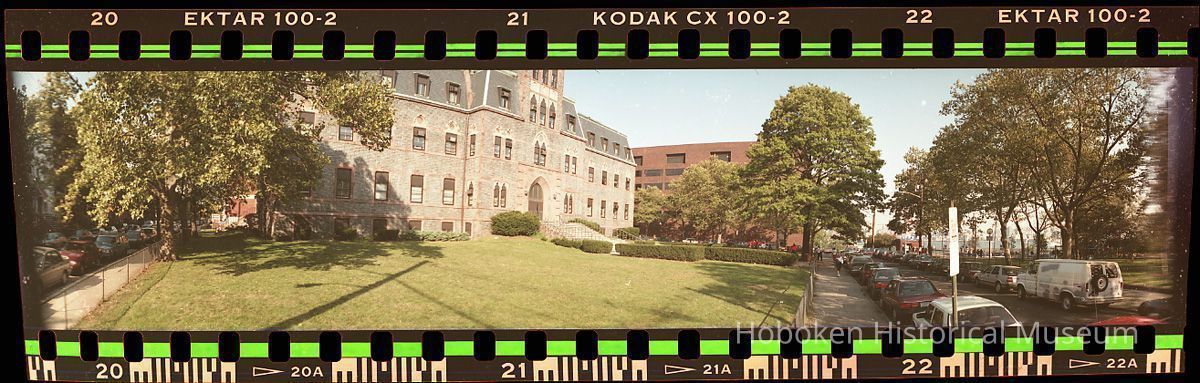 Color photographic negative of panoramic view of Edwin S. Stevens Hall, Fifth Street between Hudson and River Streets, Hoboken, no date, circa 1991-1994.