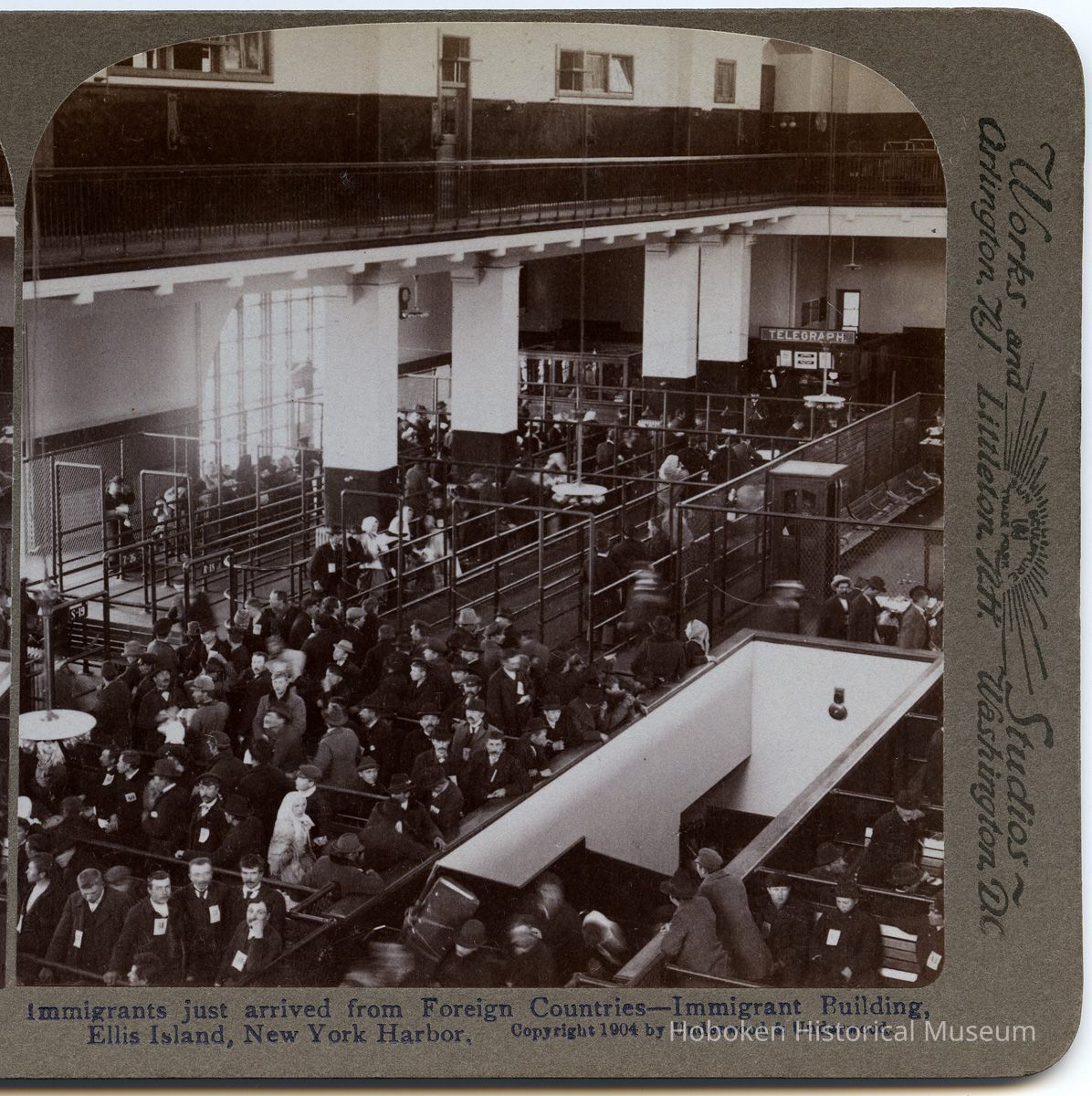 Photo stereocard: Immigrants just arrived from Foreign Countries - Immigrant Building, Ellis Island, New York Harbor. Copyright 1904 by Underwood & Underwood.