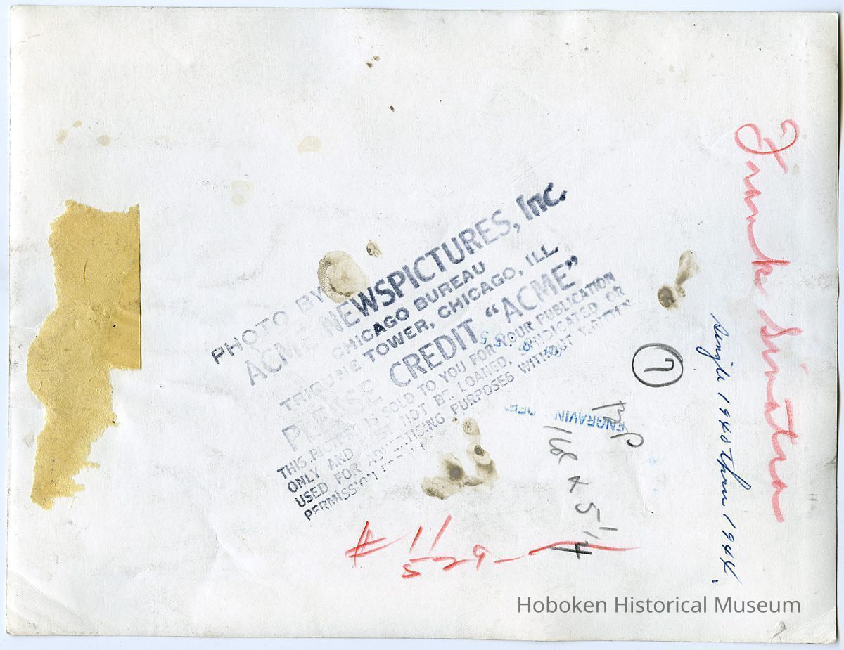 Notes: The source of this photo suggested that this was Sinatra's arrival in Hoboken (which in this era would have been Oct. 30, 1947); not considered as definitive. Original or Copy: Original Status: OK Status By: dw Status Date: 2014-05-10