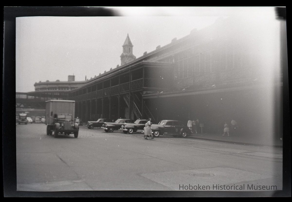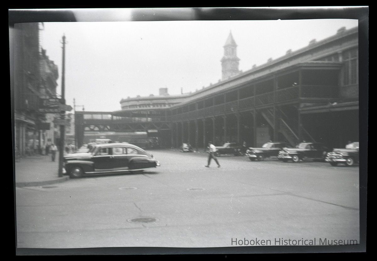 B+W photo negatives, 3, of Hudson Place from River St., Hoboken, with PSCT terminal & Lackawanna Terminal, n.d., ca.1945-1949.