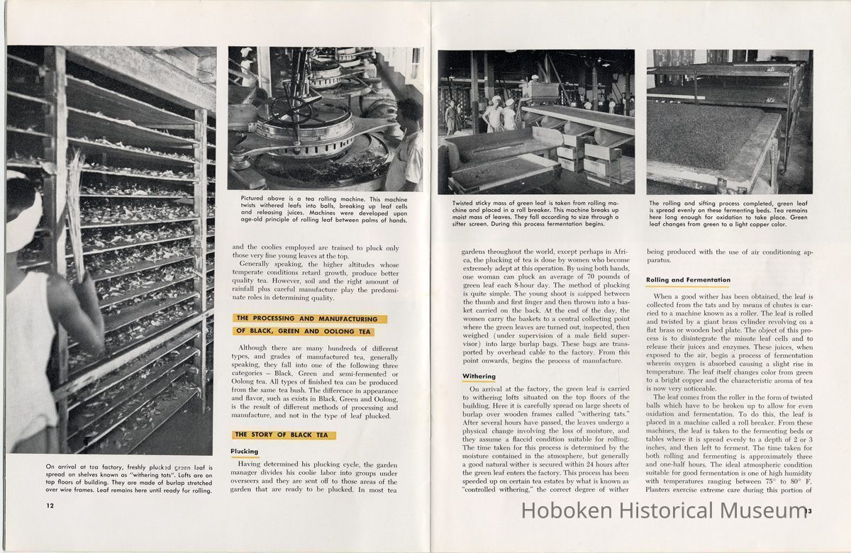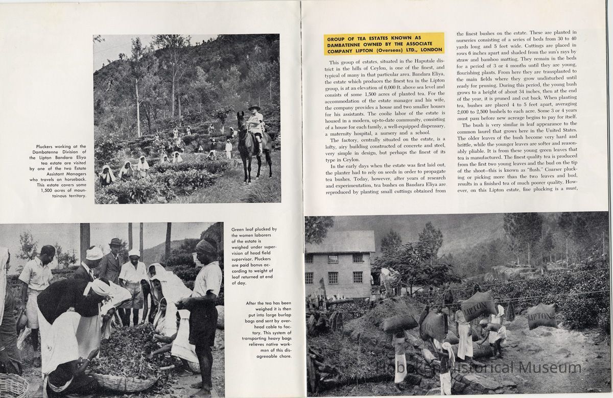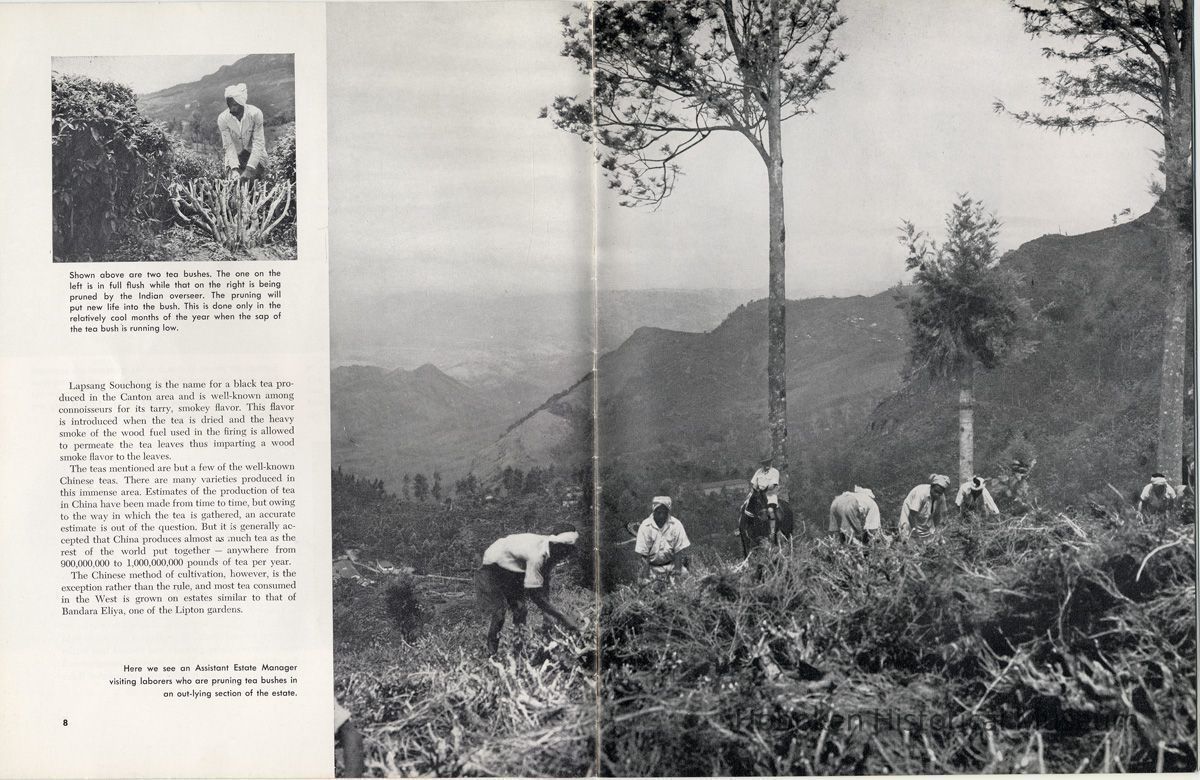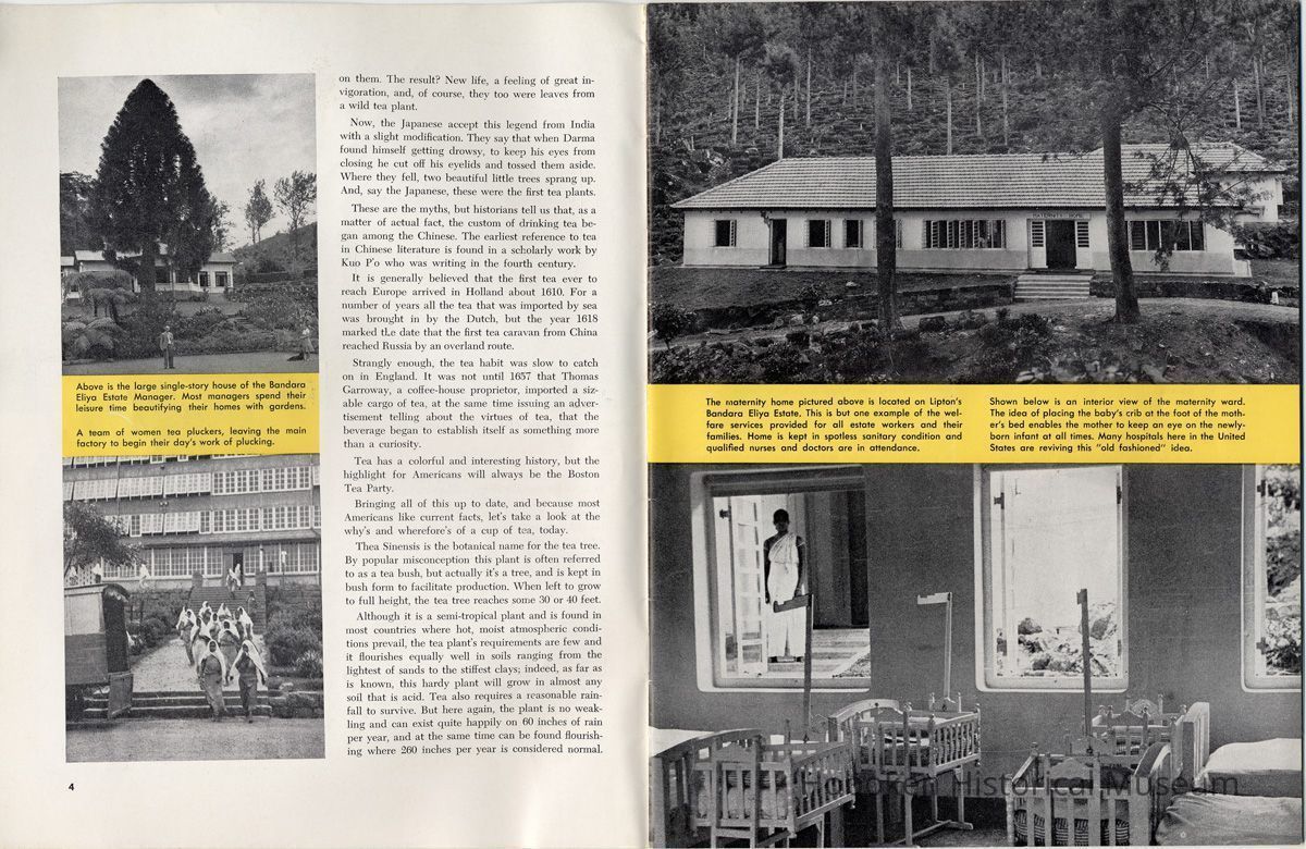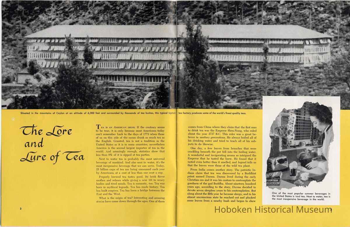 Notes: 2012.001.0178 ==== (page [1] front cover) The Lure and Lore of Tea. Published by Thomas J. Lipton, Inc., Hoboken, New Jersey. ==== (pages 2-3) The Lore and Lure of Tea TEA IS AN AMERICAN DRINK. If the contrary seems to be true, it is only because most Americans today can't remember back to the days of 1773 when those of us on this side of the ocean drank as much tea as the English. Granted, tea is not a tradition in the United States as it is in some countries; nevertheless America is the second largest importer of tea in the world. And amazingly enough, statistics show that less than 8% of it is sipped at tea parties. Next to water tea is probably the most universal beverage of mankind. And also next to water, it's the most inexpensive beverage that we can serve. Today, 25 billion cups of tea are being consumed each year by Americans, at a cost of less than one cent a cup. Properly brewed tea tastes good. Its brisk flavor soothes and relaxes while giving a new lift to weary bodies and tired minds. Tea is romantic, too. Tea was born in mythical legends. Tea has made history. Tea has built empires. Tea has been a bridge between the East and the West. What is the origin of tea? Interesting and amusing stories have come down through the ages. One of them comes from China where they claim that the first man to drink tea was the Emperor Shen-Nung, who ruled about the year 2737 B.C. This ruler was a great believer in sanitary precautions. He always boiled all of his drinking water and tried to teach all of his subjects to do likewise. One day, a few leaves from branches that were crackling beneath the pot fell into the boiling water. A wonderful and invigorating aroma so intrigued the Emperor that he tasted the brew. He found that it tasted even better than it smelled, and legend tells us that the leaves were those of the wild tea plant. From India comes another story. The patriotic Indians claim that tea was discovered by a Buddhist priest named Darma. Darma lived during the early Christian era and it was his custom to contemplate the goodness of the god Buddha. About nineteen hundred years ago, according to the story, Darma decided to devote seven sleepless years to his contemplation. But along about the fifth year he became sleepy, and in his almost unconscious state he reached out and plucked some leaves from a nearby bush and began to chew ---- [photo caption top] Situated in the mountains of Ceylon at an altitude of 6,000 feet and surrounded by thousands of tea bushes, this typical Lipton tea factory produces some of the world's finest quality teas. ---- [photo caption right] One of the most popular summer beverages in the United States is iced tea. Next to water, tea is the most inexpensive beverage in the world. ==== (pages 4-5) on them. The result? New life, a feeling of great in-vigoration, and, of course, they too were leaves from a wild tea plant. Now, the Japanese accept this legend from India with a slight modification. They say that when Darma found himself getting drowsy, to keep his eyes from closing he cut off his eyelids and tossed them aside. Where they fell, two beautiful little trees sprang up. And, say the Japanese, these were the first tea plants. These are the myths, but historians tell us that, as a matter of actual fact, the custom of drinking tea began among the Chinese. The earliest reference to tea in Chinese literature is found in a scholarly work by Kuo P'o who was writing in the fourth century. It is generally believed that the first tea ever to reach Europe arrived in Holland about 1610. For a number of years all the tea that was imported by sea was brought in by the Dutch, but the year 1618 marked tLe date that the first tea caravan from China reached Russia by an overland route. Strangly enough, the tea habit was slow to catch on in England. It was not until 1657 that Thomas Garroway, a coffee-house proprietor, imported a sizable cargo of tea, at the same time issuing an advertisement telling about the virtues of tea, that the beverage began to establish itself as something more than a curiosity. Tea has a colorful and interesting history, but the highlight for Americans will always be the Boston Tea Party. Bringing all of this up to date, and because most Americans like current facts, let's take a look at the why's and wherefore's of a cup of tea, today. Thea Sinensis is the botanical name for the tea tree. By popular misconception this plant is often referred to as a tea bush, but actually it's a tree, and is kept in bush form to facilitate production. When left to grow to full height, the tea tree reaches some 30 or 40 feet. Although it is a semi-tropical plant and is found in most countries where hot, moist atmospheric conditions prevail, the tea plant's requirements are few and it flourishes equally well in soils ranging from the lightest of sands to the stiffest clays; indeed, as far as is known, this hardy plant will grow in almost any soil that is acid. Tea also requires a reasonable rainfall to survive. But here again, the plant is no weakling and can exist quite happily on 60 inches of rain per year, and at the same time can be found flourishing where 260 inches per year is considered normal. ---- [caption top left page 4] Above is the large single-story house of the Bandara Eiiya Estate Manager. Most managers spend their leisure time beautifying their homes with gardens. ---- [caption bottom left page 4] A team of women tea pluckers, leaving the main factory to begin their day's work of plucking. ---- [captions for 2 photos page [5]) The maternity home pictured above is located on Lipton's Bandara Eliya Estate. This is but one example of the welfare services provided for all estate workers and their families. Home is kept in spotless sanitary condition and qualified nurses and doctors are in attendance. Shown below is an interior view of the maternity ward. The idea of placing the baby's crib at the foot of the mother's bed enables the moth