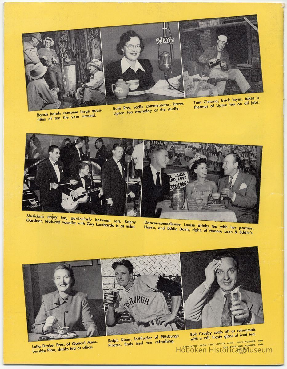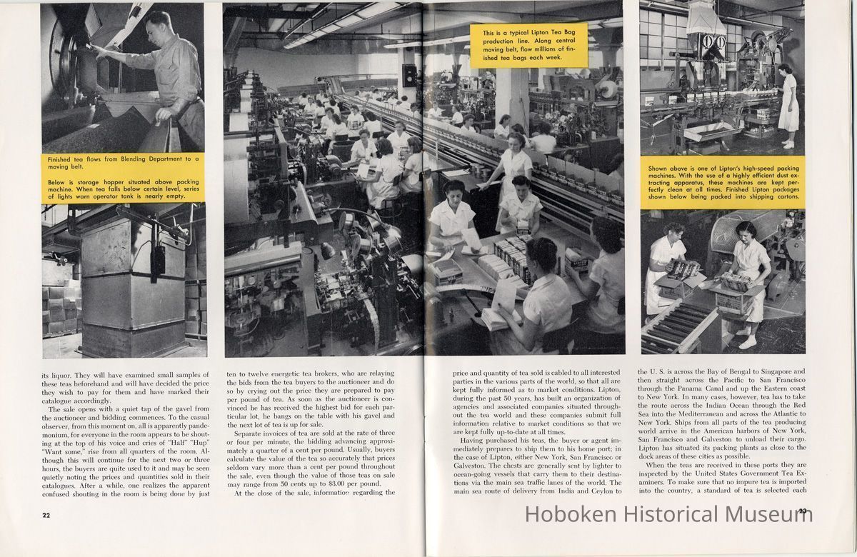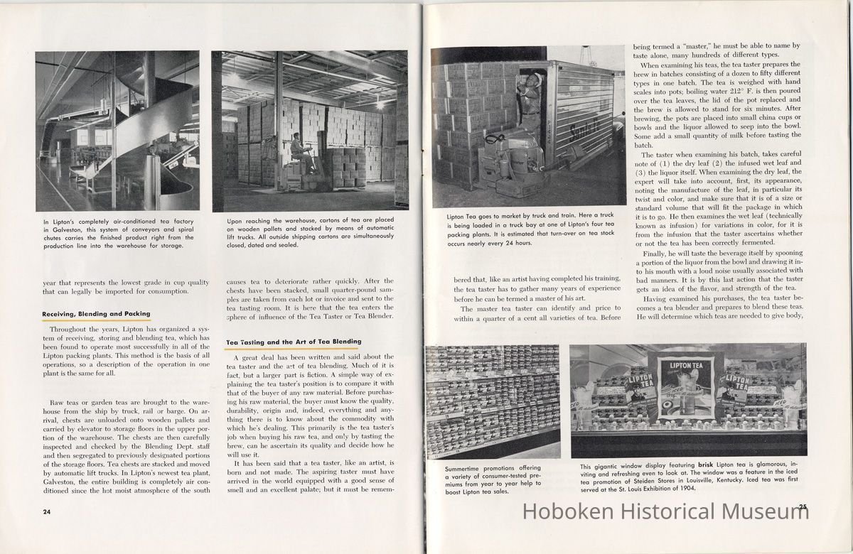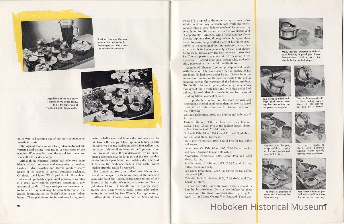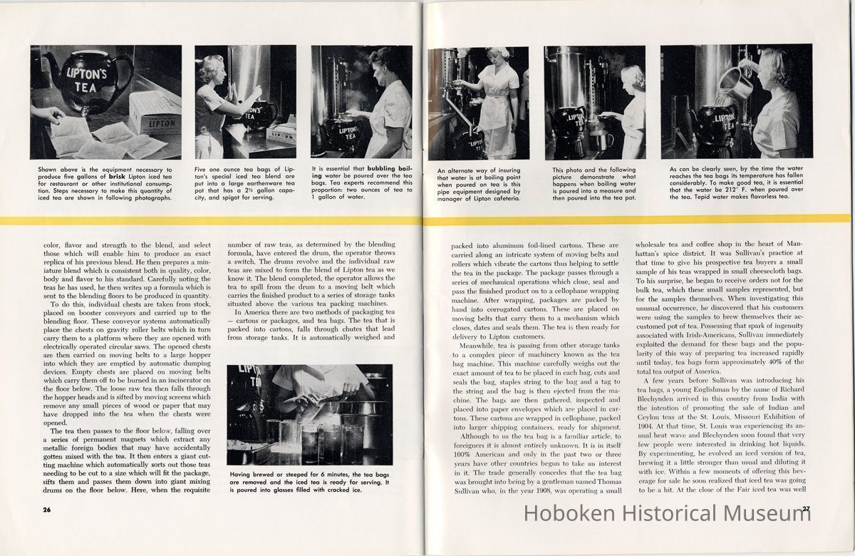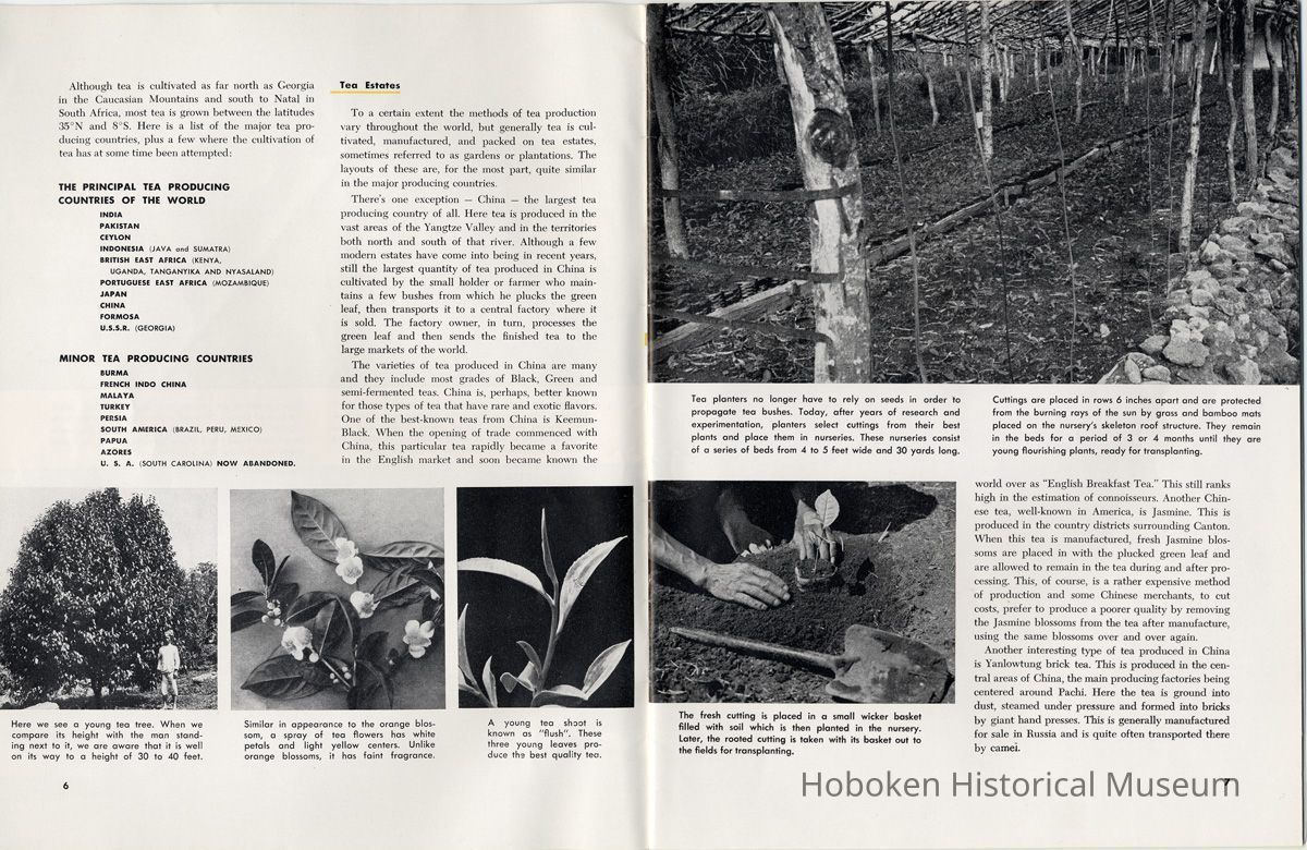 Notes: 2012.001.0178 ==== (page [1] front cover) The Lure and Lore of Tea. Published by Thomas J. Lipton, Inc., Hoboken, New Jersey. ==== (pages 2-3) The Lore and Lure of Tea TEA IS AN AMERICAN DRINK. If the contrary seems to be true, it is only because most Americans today can't remember back to the days of 1773 when those of us on this side of the ocean drank as much tea as the English. Granted, tea is not a tradition in the United States as it is in some countries; nevertheless America is the second largest importer of tea in the world. And amazingly enough, statistics show that less than 8% of it is sipped at tea parties. Next to water tea is probably the most universal beverage of mankind. And also next to water, it's the most inexpensive beverage that we can serve. Today, 25 billion cups of tea are being consumed each year by Americans, at a cost of less than one cent a cup. Properly brewed tea tastes good. Its brisk flavor soothes and relaxes while giving a new lift to weary bodies and tired minds. Tea is romantic, too. Tea was born in mythical legends. Tea has made history. Tea has built empires. Tea has been a bridge between the East and the West. What is the origin of tea? Interesting and amusing stories have come down through the ages. One of them comes from China where they claim that the first man to drink tea was the Emperor Shen-Nung, who ruled about the year 2737 B.C. This ruler was a great believer in sanitary precautions. He always boiled all of his drinking water and tried to teach all of his subjects to do likewise. One day, a few leaves from branches that were crackling beneath the pot fell into the boiling water. A wonderful and invigorating aroma so intrigued the Emperor that he tasted the brew. He found that it tasted even better than it smelled, and legend tells us that the leaves were those of the wild tea plant. From India comes another story. The patriotic Indians claim that tea was discovered by a Buddhist priest named Darma. Darma lived during the early Christian era and it was his custom to contemplate the goodness of the god Buddha. About nineteen hundred years ago, according to the story, Darma decided to devote seven sleepless years to his contemplation. But along about the fifth year he became sleepy, and in his almost unconscious state he reached out and plucked some leaves from a nearby bush and began to chew ---- [photo caption top] Situated in the mountains of Ceylon at an altitude of 6,000 feet and surrounded by thousands of tea bushes, this typical Lipton tea factory produces some of the world's finest quality teas. ---- [photo caption right] One of the most popular summer beverages in the United States is iced tea. Next to water, tea is the most inexpensive beverage in the world. ==== (pages 4-5) on them. The result? New life, a feeling of great in-vigoration, and, of course, they too were leaves from a wild tea plant. Now, the Japanese accept this legend from India with a slight modification. They say that when Darma found himself getting drowsy, to keep his eyes from closing he cut off his eyelids and tossed them aside. Where they fell, two beautiful little trees sprang up. And, say the Japanese, these were the first tea plants. These are the myths, but historians tell us that, as a matter of actual fact, the custom of drinking tea began among the Chinese. The earliest reference to tea in Chinese literature is found in a scholarly work by Kuo P'o who was writing in the fourth century. It is generally believed that the first tea ever to reach Europe arrived in Holland about 1610. For a number of years all the tea that was imported by sea was brought in by the Dutch, but the year 1618 marked tLe date that the first tea caravan from China reached Russia by an overland route. Strangly enough, the tea habit was slow to catch on in England. It was not until 1657 that Thomas Garroway, a coffee-house proprietor, imported a sizable cargo of tea, at the same time issuing an advertisement telling about the virtues of tea, that the beverage began to establish itself as something more than a curiosity. Tea has a colorful and interesting history, but the highlight for Americans will always be the Boston Tea Party. Bringing all of this up to date, and because most Americans like current facts, let's take a look at the why's and wherefore's of a cup of tea, today. Thea Sinensis is the botanical name for the tea tree. By popular misconception this plant is often referred to as a tea bush, but actually it's a tree, and is kept in bush form to facilitate production. When left to grow to full height, the tea tree reaches some 30 or 40 feet. Although it is a semi-tropical plant and is found in most countries where hot, moist atmospheric conditions prevail, the tea plant's requirements are few and it flourishes equally well in soils ranging from the lightest of sands to the stiffest clays; indeed, as far as is known, this hardy plant will grow in almost any soil that is acid. Tea also requires a reasonable rainfall to survive. But here again, the plant is no weakling and can exist quite happily on 60 inches of rain per year, and at the same time can be found flourishing where 260 inches per year is considered normal. ---- [caption top left page 4] Above is the large single-story house of the Bandara Eiiya Estate Manager. Most managers spend their leisure time beautifying their homes with gardens. ---- [caption bottom left page 4] A team of women tea pluckers, leaving the main factory to begin their day's work of plucking. ---- [captions for 2 photos page [5]) The maternity home pictured above is located on Lipton's Bandara Eliya Estate. This is but one example of the welfare services provided for all estate workers and their families. Home is kept in spotless sanitary condition and qualified nurses and doctors are in attendance. Shown below is an interior view of the maternity ward. The idea of placing the baby's crib at the foot of the mother's bed enables the moth