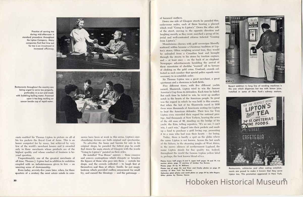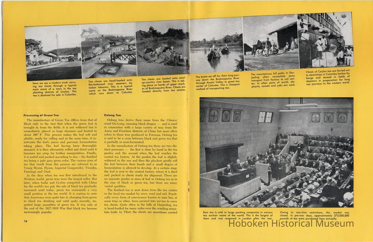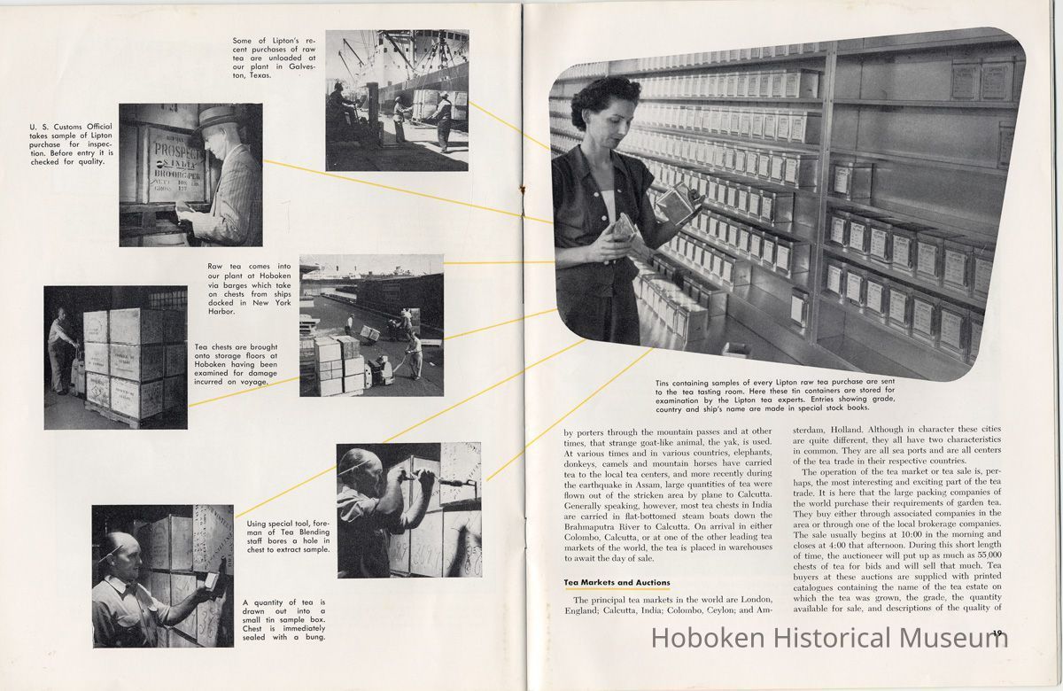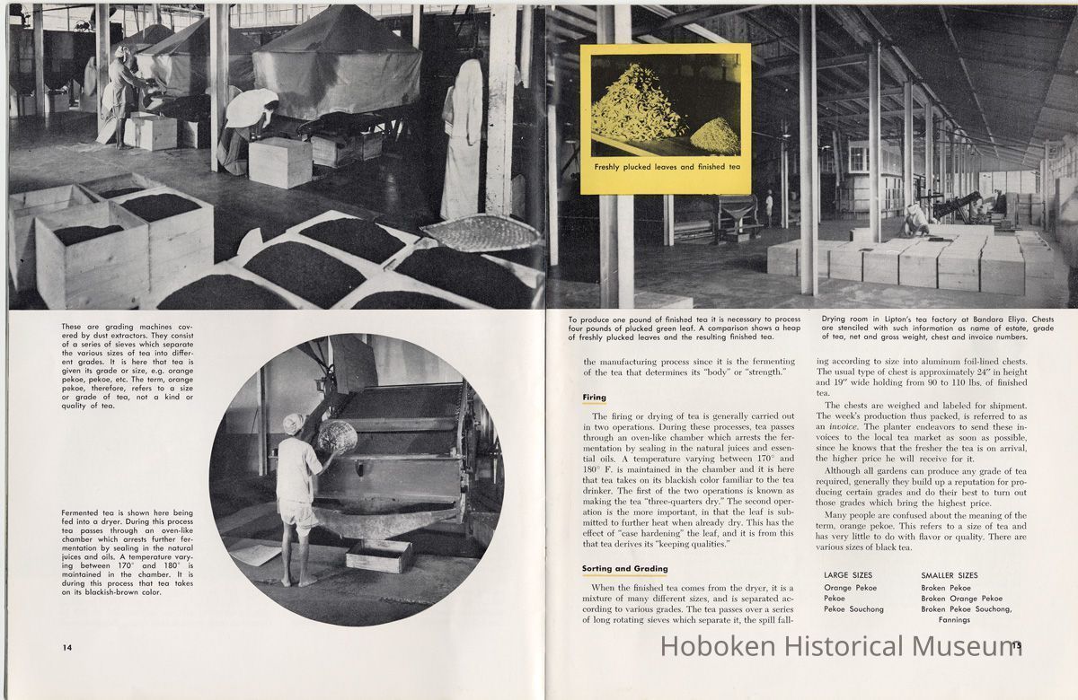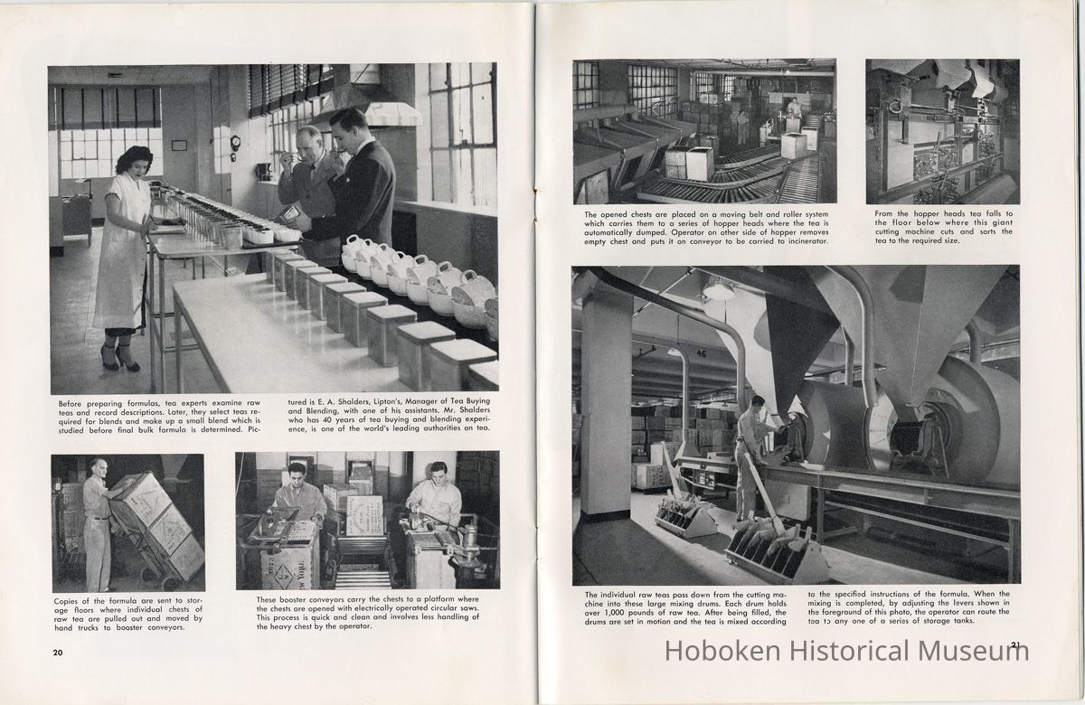 Notes: 2012.001.0178 ==== (page [1] front cover) The Lure and Lore of Tea. Published by Thomas J. Lipton, Inc., Hoboken, New Jersey. ==== (pages 2-3) The Lore and Lure of Tea TEA IS AN AMERICAN DRINK. If the contrary seems to be true, it is only because most Americans today can't remember back to the days of 1773 when those of us on this side of the ocean drank as much tea as the English. Granted, tea is not a tradition in the United States as it is in some countries; nevertheless America is the second largest importer of tea in the world. And amazingly enough, statistics show that less than 8% of it is sipped at tea parties. Next to water tea is probably the most universal beverage of mankind. And also next to water, it's the most inexpensive beverage that we can serve. Today, 25 billion cups of tea are being consumed each year by Americans, at a cost of less than one cent a cup. Properly brewed tea tastes good. Its brisk flavor soothes and relaxes while giving a new lift to weary bodies and tired minds. Tea is romantic, too. Tea was born in mythical legends. Tea has made history. Tea has built empires. Tea has been a bridge between the East and the West. What is the origin of tea? Interesting and amusing stories have come down through the ages. One of them comes from China where they claim that the first man to drink tea was the Emperor Shen-Nung, who ruled about the year 2737 B.C. This ruler was a great believer in sanitary precautions. He always boiled all of his drinking water and tried to teach all of his subjects to do likewise. One day, a few leaves from branches that were crackling beneath the pot fell into the boiling water. A wonderful and invigorating aroma so intrigued the Emperor that he tasted the brew. He found that it tasted even better than it smelled, and legend tells us that the leaves were those of the wild tea plant. From India comes another story. The patriotic Indians claim that tea was discovered by a Buddhist priest named Darma. Darma lived during the early Christian era and it was his custom to contemplate the goodness of the god Buddha. About nineteen hundred years ago, according to the story, Darma decided to devote seven sleepless years to his contemplation. But along about the fifth year he became sleepy, and in his almost unconscious state he reached out and plucked some leaves from a nearby bush and began to chew ---- [photo caption top] Situated in the mountains of Ceylon at an altitude of 6,000 feet and surrounded by thousands of tea bushes, this typical Lipton tea factory produces some of the world's finest quality teas. ---- [photo caption right] One of the most popular summer beverages in the United States is iced tea. Next to water, tea is the most inexpensive beverage in the world. ==== (pages 4-5) on them. The result? New life, a feeling of great in-vigoration, and, of course, they too were leaves from a wild tea plant. Now, the Japanese accept this legend from India with a slight modification. They say that when Darma found himself getting drowsy, to keep his eyes from closing he cut off his eyelids and tossed them aside. Where they fell, two beautiful little trees sprang up. And, say the Japanese, these were the first tea plants. These are the myths, but historians tell us that, as a matter of actual fact, the custom of drinking tea began among the Chinese. The earliest reference to tea in Chinese literature is found in a scholarly work by Kuo P'o who was writing in the fourth century. It is generally believed that the first tea ever to reach Europe arrived in Holland about 1610. For a number of years all the tea that was imported by sea was brought in by the Dutch, but the year 1618 marked tLe date that the first tea caravan from China reached Russia by an overland route. Strangly enough, the tea habit was slow to catch on in England. It was not until 1657 that Thomas Garroway, a coffee-house proprietor, imported a sizable cargo of tea, at the same time issuing an advertisement telling about the virtues of tea, that the beverage began to establish itself as something more than a curiosity. Tea has a colorful and interesting history, but the highlight for Americans will always be the Boston Tea Party. Bringing all of this up to date, and because most Americans like current facts, let's take a look at the why's and wherefore's of a cup of tea, today. Thea Sinensis is the botanical name for the tea tree. By popular misconception this plant is often referred to as a tea bush, but actually it's a tree, and is kept in bush form to facilitate production. When left to grow to full height, the tea tree reaches some 30 or 40 feet. Although it is a semi-tropical plant and is found in most countries where hot, moist atmospheric conditions prevail, the tea plant's requirements are few and it flourishes equally well in soils ranging from the lightest of sands to the stiffest clays; indeed, as far as is known, this hardy plant will grow in almost any soil that is acid. Tea also requires a reasonable rainfall to survive. But here again, the plant is no weakling and can exist quite happily on 60 inches of rain per year, and at the same time can be found flourishing where 260 inches per year is considered normal. ---- [caption top left page 4] Above is the large single-story house of the Bandara Eiiya Estate Manager. Most managers spend their leisure time beautifying their homes with gardens. ---- [caption bottom left page 4] A team of women tea pluckers, leaving the main factory to begin their day's work of plucking. ---- [captions for 2 photos page [5]) The maternity home pictured above is located on Lipton's Bandara Eliya Estate. This is but one example of the welfare services provided for all estate workers and their families. Home is kept in spotless sanitary condition and qualified nurses and doctors are in attendance. Shown below is an interior view of the maternity ward. The idea of placing the baby's crib at the foot of the mother's bed enables the moth