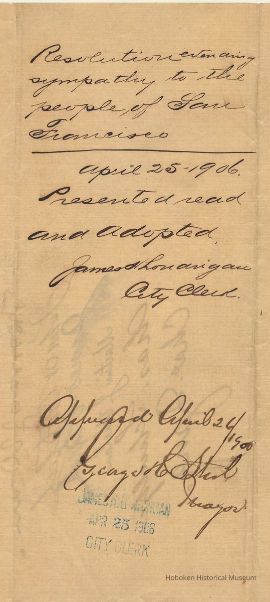 Notes: archives 2012.004.0046 ==== WHEREAS, The terrible calamity which has overtaken our sister city of San Francisco has awakened feelings of the most profound and heartfelt sympathy over our entire land and stirred the national heart with intense fraternal sorrow,therefore, RESOLVED, That the Mayor and Council of the City of Hoboken in behalf of the people of this city hereby manifests its intense sorrow at the calamity which has befallen our sister city of San Francisco and we extend to our suffering bretheren of that city our heartfelt sympathy and express the confident hope that out of its ashes San Francisco will arise Phoenix like to be once again the Queen City of the Pacific James B. Fitzpatrick Hermann R. Hoppe Thomas Wren John W. Ortlich James Clark Martin J. Whelan Chas. Schultze Charles Zang Status: OK Status By: dw Status Date: 2012-10-22