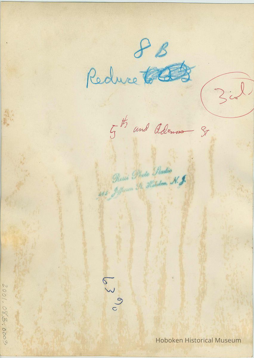 7" x 10" print. Photograph taken by Rossi Photo Studio, 615 Jefferson Street, Hoboken, N.J. with ink stamp on reverse along with various ink notations associated with some publication of the photo. Slightly cockled and showing marks on the reverse from framing materials. Noted on reverse as being on Adams Street, however architecture of building in the background shows that it is Jefferson.