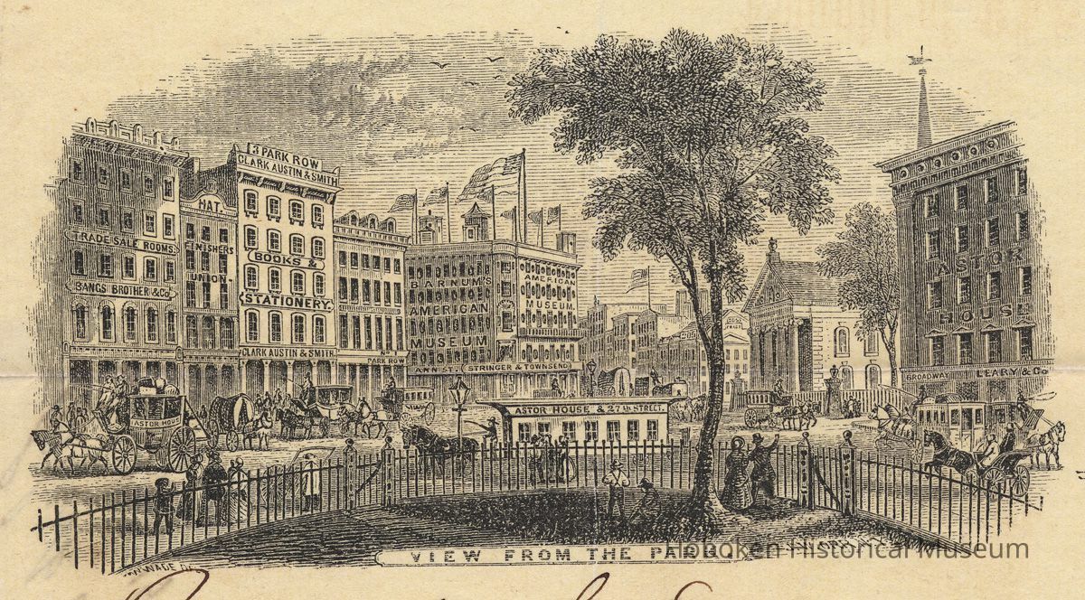 Notes: archives 2012.004.0049 ==== Full printed text on billhead: Clark, Austin & Smith, Dealers in Books and Stationery, No. 3 Park Row and 3 Ann-St. Opposite the Astor House, and two doors from the American Museum (Removed from 205 Broadway.) School and Miscellaneous Books, Blank Books, Paper, &c, &c., at Wholesale. Publishers of McGuffey's Electic Series of School Books. --- This billhead with the printed dateline as "185_" was apparently in use since 1851 when the company moved to Park Row from 205 Broadway (as printed.) The vignette illustration, View From the Park, was a wood engraving by John William Orr (1815-1887) signed lower right as J.W. Orr N.Y.; signed lower left: W.Wade, Del. [deliniator]. Orr was a commercial engraver at 75 Nassau St. and while prolific, he is not very well known. The art is not dated, but it is likely from 1851. The view is south showing the narrow end of the park (that is now known as City Hall Park) where Park Row meets Broadway (right). Ann and Vesey Street corners are seen plus the vista down Broadway. The engraving is a snapshot of its time documenting the area in the early 1850s (although contemporary photographic views of this area are extant.) From right: Astor House; Leary & Co. (hatters on ground floor of Astor House; succeeded by 1860 by Hunt & Dusenberry, Men's Hatters); Saint Paul's Chapel; Barnum's American Museum (corner of Ann St. & Broadway); Stringer & Townsend (publishing firm, 222 Broadway - street level of Museum at Park Row & Ann St.); 3 Park Row - Clark, Austin & Smith, Books & Stationery; Hat Finishers Union; Trade Sale Rooms - Bangs, Brother & Co. The last company, Bangs, Brother & Co., was an auction sales business (books, art, coins, etc.) that suspended operations in a financial panic in 1857, but it was reorganized the same year and continued under the name Bangs, Merwin & Co. Status: OK Status By: dw Status Date: 2012-10-22