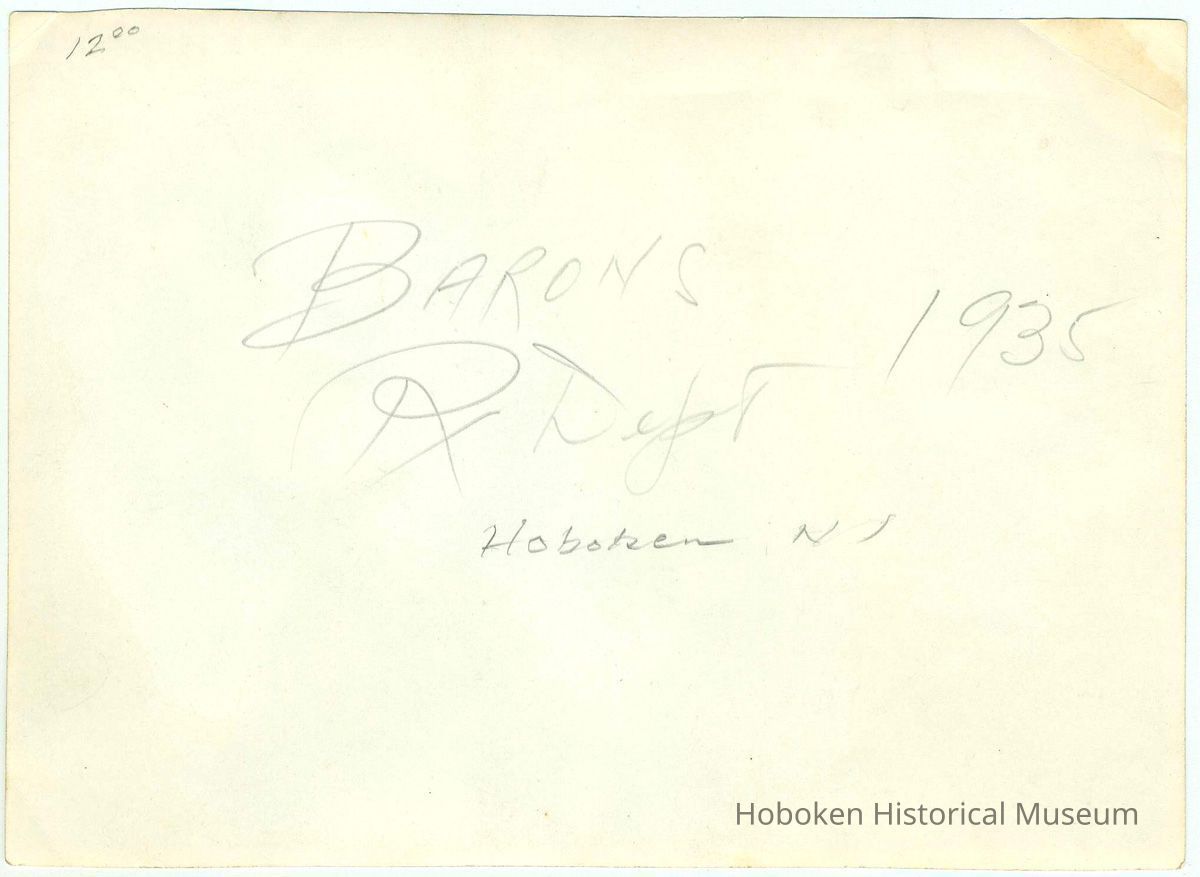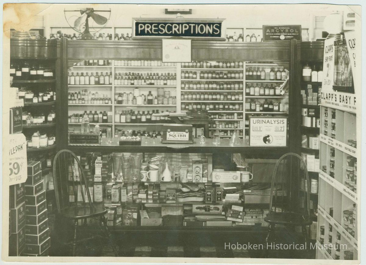 Black-and-white photo of the prescription department of Baron's Drugstore, Hoboken, 1935. 4-3/4" high x 6-3/4" wide print. Reverse has holographic pencil annotations, some contemporary, some modern.