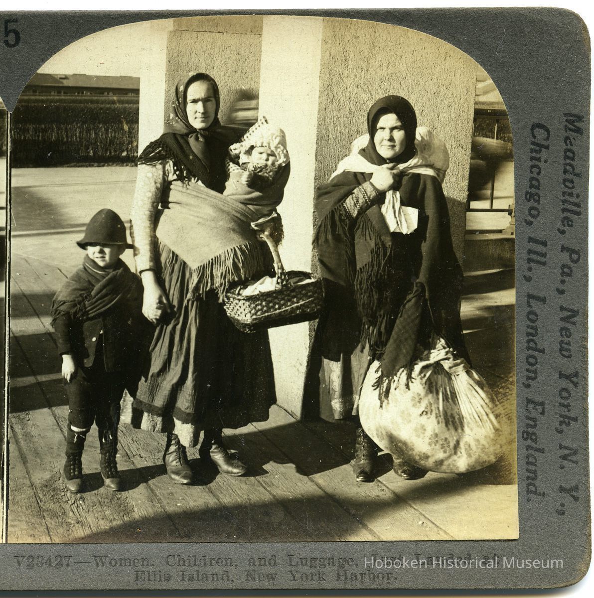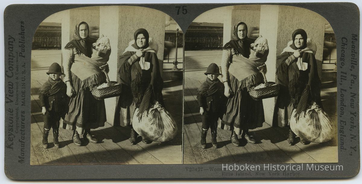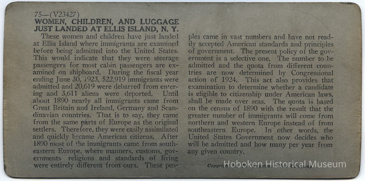 Notes: Exhibition 2014: Hoboken, Ellis Island, and the Immigrant Experience, 1892-1924 ==== Text printed on back of card: 75 — (V23427) WOMEN, CHILDREN, AND LUGGAGE JUST LANDED AT ELLIS ISLAND, N. Y. These women and children have just landed at Ellis Island where immigrants are examined before being admitted into the United States. This would indicate that they were steerage passengers for most cabin passengers are examined on shipboard. During the fiscal year ending June 30, 1923, 522,919 immigrants were admitted and 20,619 were debarred from entering and 3,611 aliens were deported. Until about 1890 nearly all immigrants came from Great Britain and Ireland, Germany and Scandinavian countries. That is to say, they came from the same parts of Europe as the original settlers. Therefore, they were easily assimilated and quickly became American citizens. After 1890 most of the immigrants came from southeastern Europe, where manners, customs, governments religions and standards of living were entirely different from ours. These peoples came in vast numbers and have not readily accepted American standards and principles of government. The present policy of the government is a selective one. The number to be admitted and the quota from different countries are now determined by Congressional action of 1924. This act also provides that examination to determine whether a candidate is. eligible to citizenship under American laws, shall be made over seas. The quota is based on the census of 1890 with the result that the greater number of immigrants will come from northern and western Europe instead of from southeastern Europe. In other words, the United States Government now decides who will be admitted and how many per year from any given country. Copyright by The Keystone View Company. ==== ==== Original or Copy: Original Status: OK Status By: dw Status Date: 2014-05-11