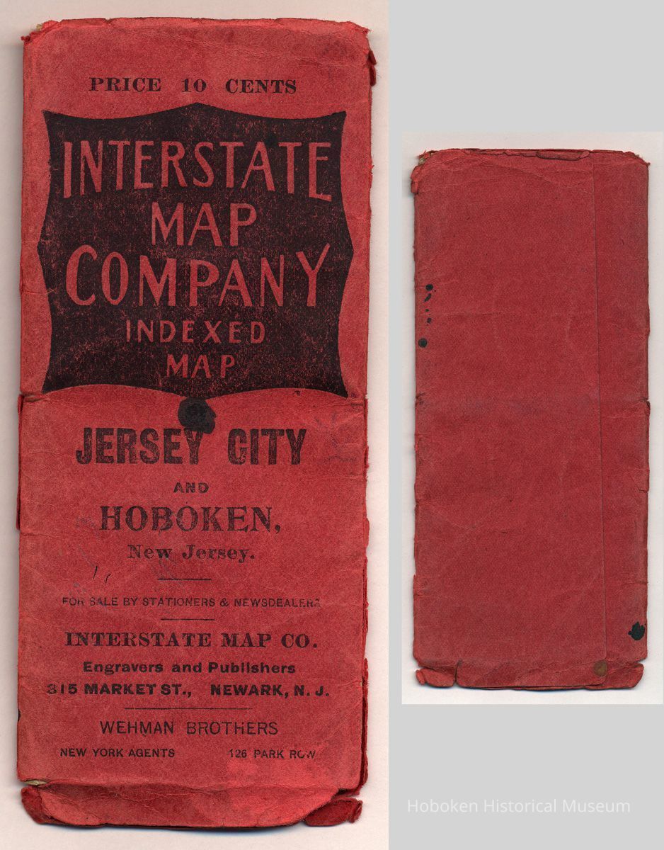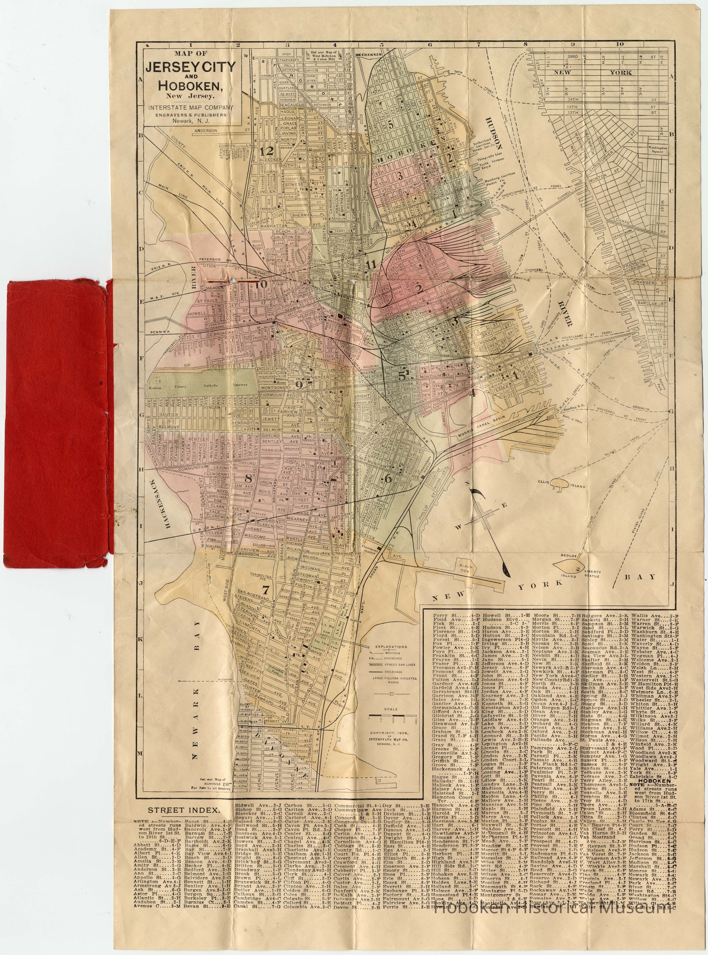 Map of Jersey City and Hoboken, New Jersey. Interstate Map Company Indexed Map. Copyright 1904. Fold-out map printed in color, 12-3/8" wide x 19-7/8" high in red folder printed in black, 2-/5/8" wide x 6-1/8" high. PDF on file. Large tiff on file.