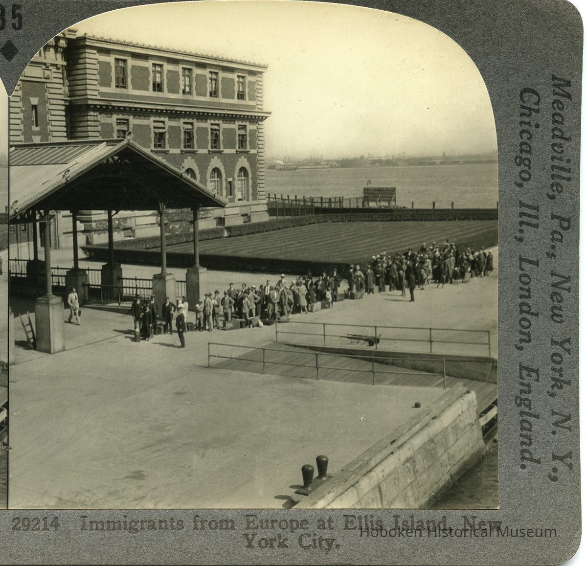 Notes: Exhibition 2014: Hoboken, Ellis Island, and the Immigrant Experience, 1892-1924 ==== Text printed on back of card: 32 — (29214) IMMIGRANTS FROM EUROPE AT ELLIS ISLAND, NEW YORK CITY Ellis Island is a small island belonging to the United States government. It is located in New York Harbor not far from the Statue of Liberty. All immigrants who enter this country through the port of New York are first taken to Ellis Island. Imagine that you are an immigrant on board a steamer just entering New York Harbor. A ferryboat takes you from your ship to Ellis Island where you land. How good it feels to be on shore! How glad you are to be in the “land of the free”! Yet it doesn’t seem so “free” for you are guarded by officers who escort you to a building where you are examined to make sure you are fit to become a possible citizen of the United States. That seems hard, for you feel sure you are “fit.” However, if this country should admit criminals, paupers, and people having contagious diseases, it would not long remain the kind of a country in which you, or anyone, would wish to live! So you see this examination safeguards you as well as protects the people who have already lived in the United States many years and who have helped make it a good country. In the examination rooms you must tell the officers your name, age, occupation, who your friends are, where they live, and what you expect to do. You must have a certain amount of money. Doctors examine you. At last you are told that you have been accepted. How happy you are! A government vessel now takes you to the southern end of the city of New York. You land there and are free to begin life in this great land offering “liberty and justice to all.” Copyright by The Keystone View Company. ==== ==== Original or Copy: Original Status: OK Status By: dw Status Date: 2014-05-11