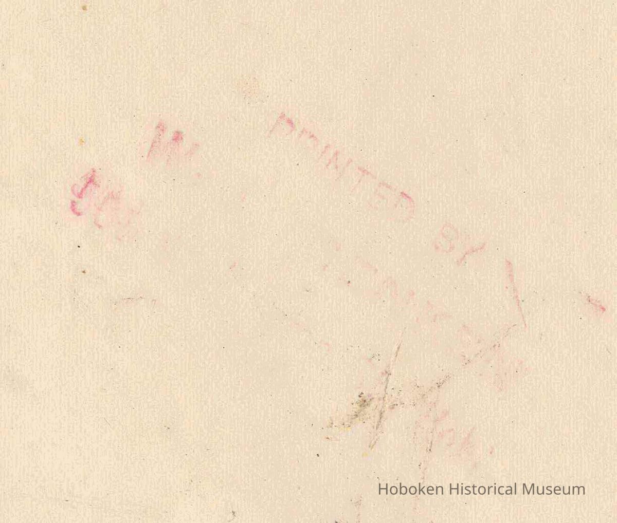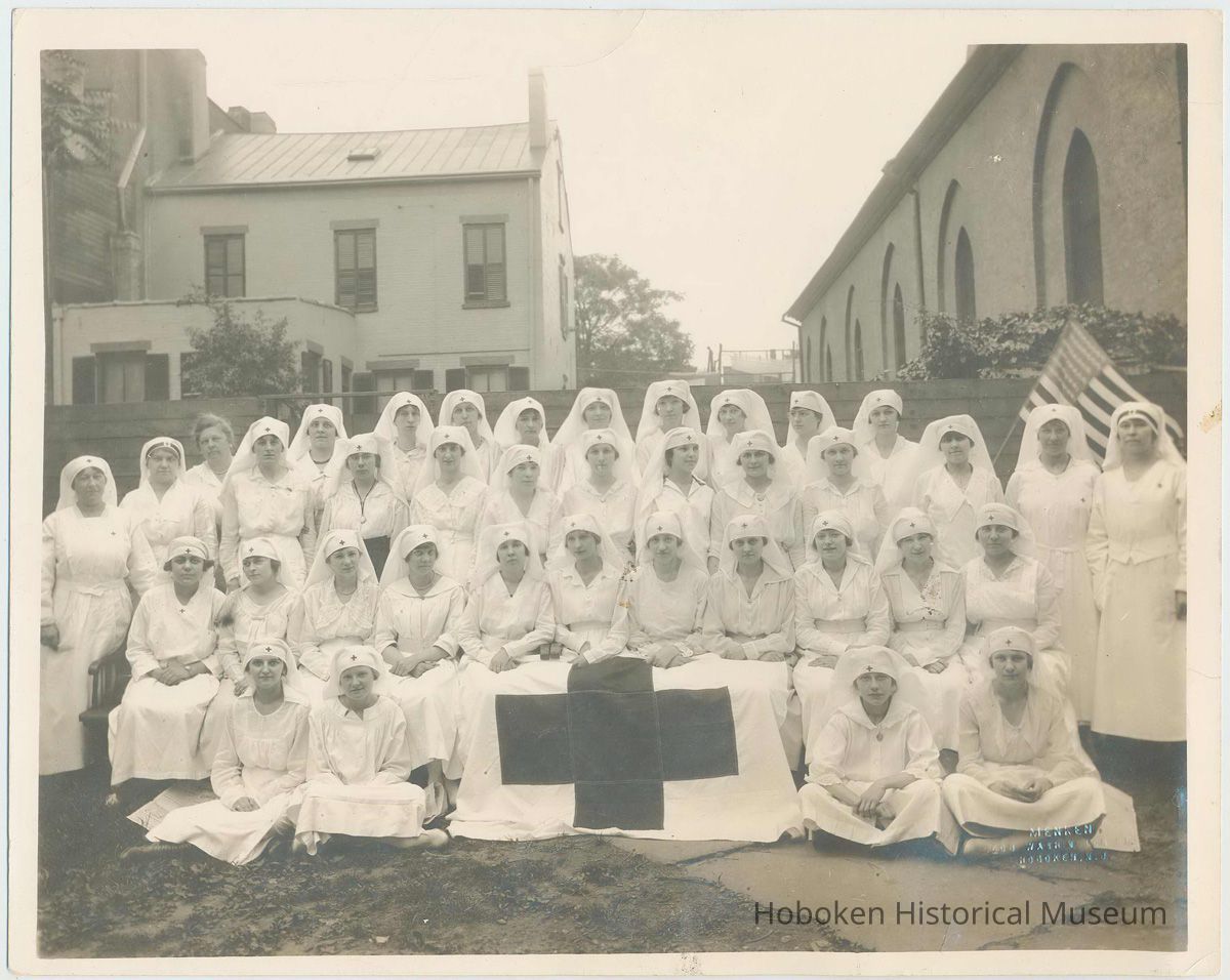 Sepia-tone group photo of a nursing class at the east end of the yard of the Martha Institute, on Sixth St., between Park Ave. and Garden St., Hoboken, no date, ca. 1920. 8" x 10" wide. At the right is the side exterior of the German Evangelical Church at the corner of Park Ave. and Sixth St. The view is looking east. Reverse has only the photographer's ink stamp. None of the people are identified.