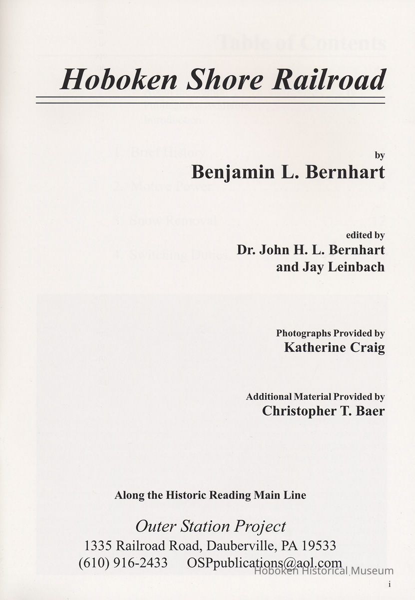 Hoboken Shore Railroad. By Benjamin L. Bernhart. Edited by Dr. John. H. L. Bernhard and Jay Leinbach. Photographs provided by Katherine Craig. Additional Material Provided by Christopher T. Baer. Dauberville, PA: Outer Station Project, no date (circa 2006-2007.) First thus. 8vo softcover. pp. vi, 22 plus cover; photo illustrated.