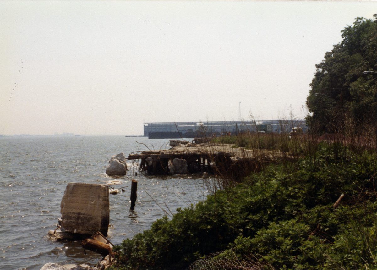 Color photos, two, waterfront looking south from near Eighth Street, Hoboken, June 1985.