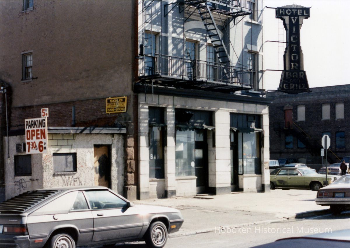 Color photos, three, of Hotel Victor and parking lot north of building (former Lyric Theatre site), Hoboken, May 1986.