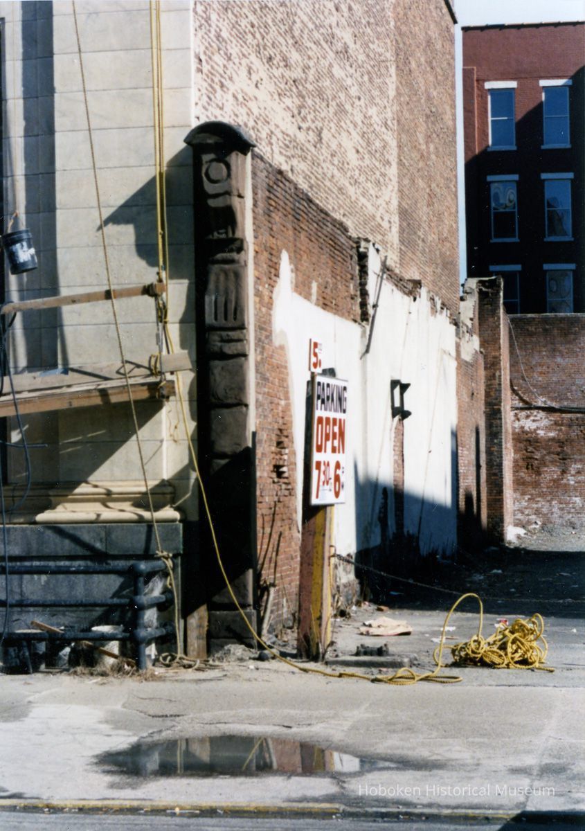 Color photos, 3, of Hotel Victor & parking lot north (former Lyric Theatre site), Hoboken, May 1986.