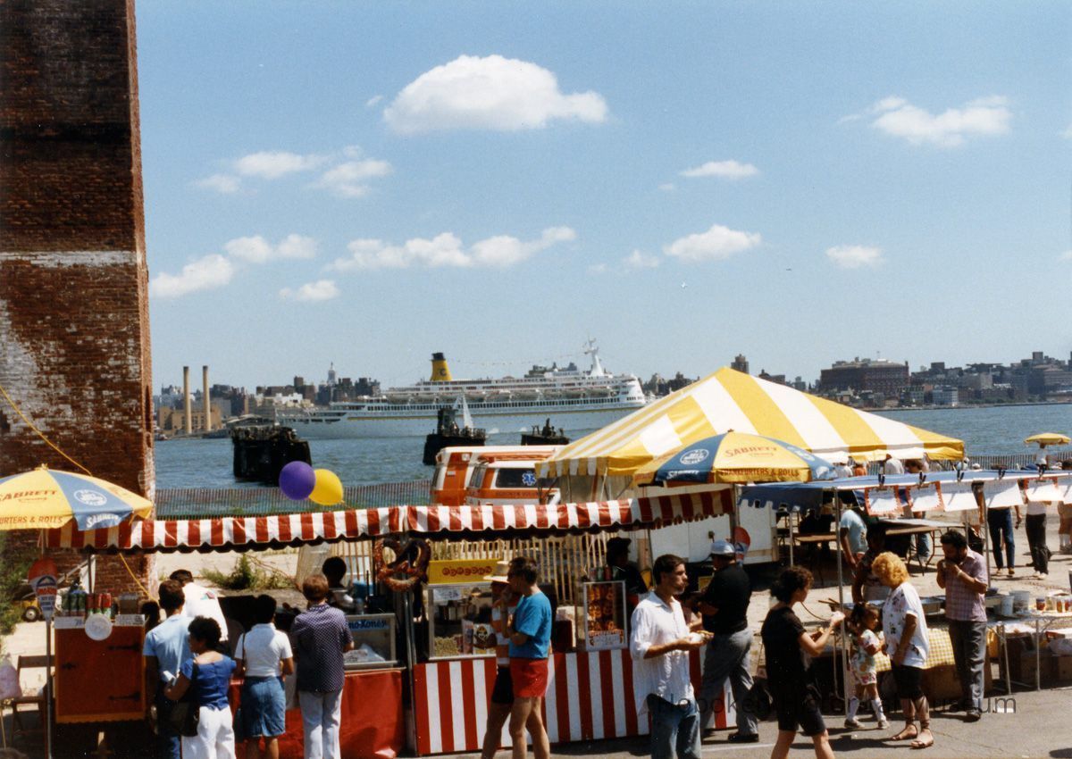 1: view east of River City Fair; outbound ocean liner on Hudson River.