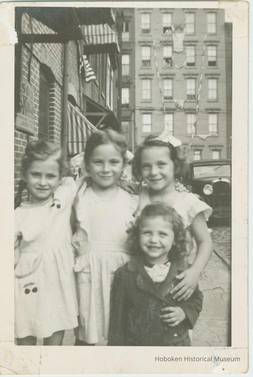 Black-and-white photo of 4 girls posing on Willow Terrace North, Hoboken, no date, ca. 1940-1945. 3" wide x 4" high print. Reverse has contemporary holographic ink identification of the girls, but see below for 2011 corrections.