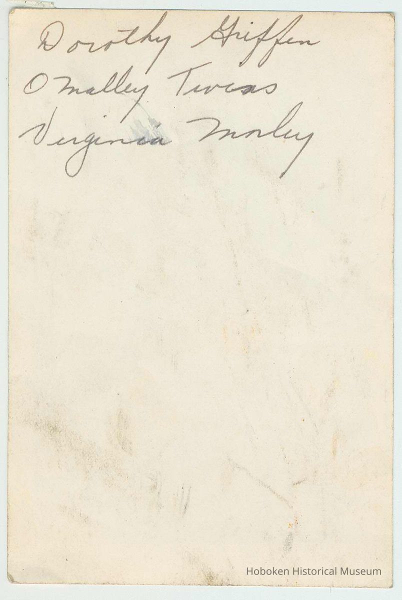 Which girl is Griffin or Morley is not given. Such identifications are typically listed left to right. The two O'Malley girls' (who appear to be twins, but are not - see below) mother may be Mamie O'Malley who is seen in photo catalog 2001.119.0002 along with Margie Morley who may be Virginia's sister.