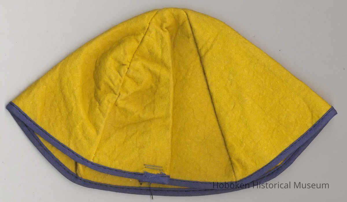 Cap, beanie - style, from the 1955 City of Hoboken Centennial celebration. Gold felt with navy blue cloth edging. Printed, two lines, all caps 1" high condensed block lettering: Hoboken Centennial. Circa 8" diameter x 4-5" high.