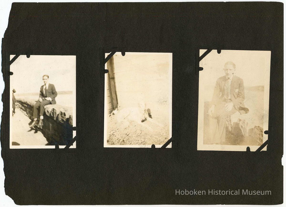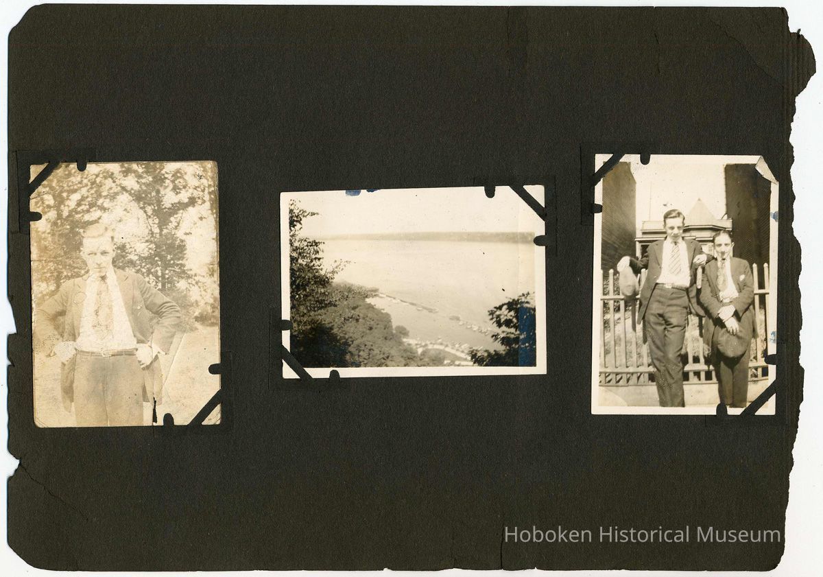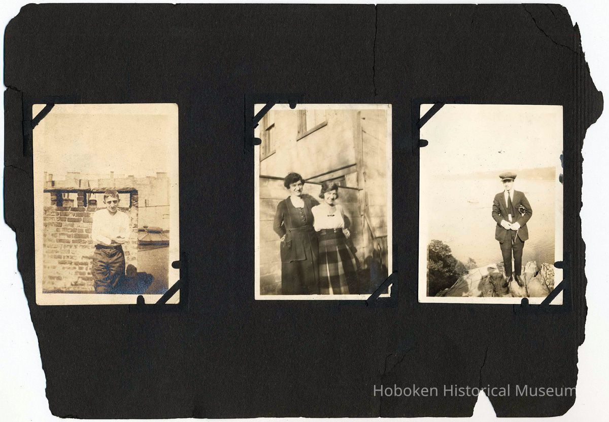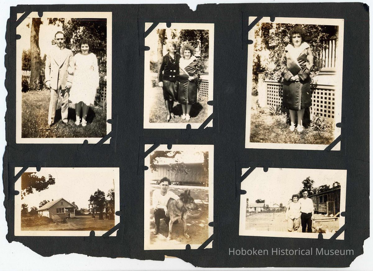 Forty-six black-and-white photos carefully mounted with photo corners. The size and number of images vary from page to page. Brittle black paper ca. 7" x 10" long, numerous edge chips and not bound. There are no captions and the backs of the few that were checked did not reveal any information. Where a page is noted as blank, it did not have any evidence of anything ever attached to it. While some of the images appear to have been taken in Hoboken, many were not. Each page is imaged in full with the leaf sequence related to images of similar sizes.