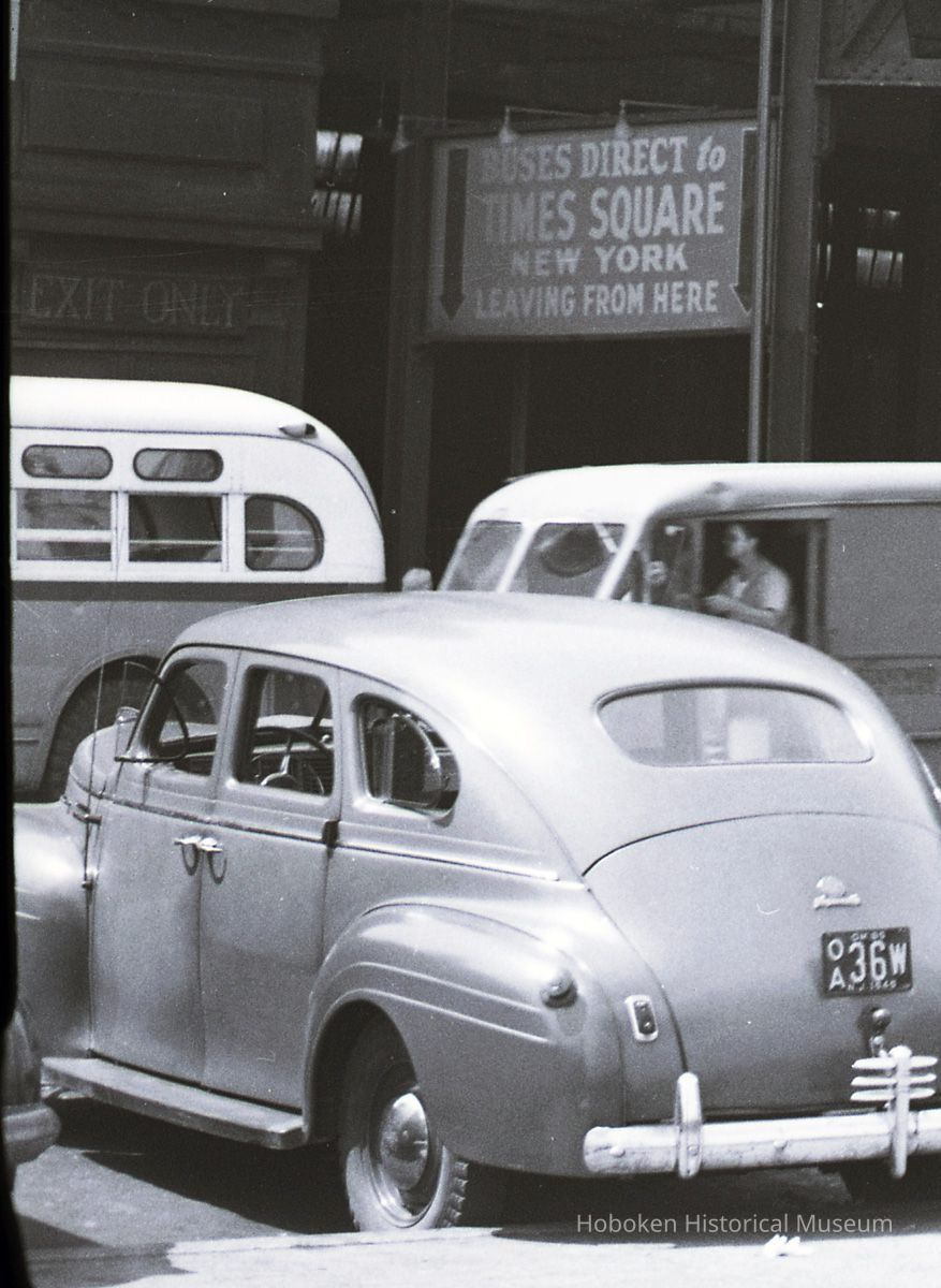 Black-and-white photographic negative of Public Service Coordinated Transport (PSCT) Hudson Place Terminal, Hudson Place and Lackawanna Plaza, Hoboken, no date, circa 1945.