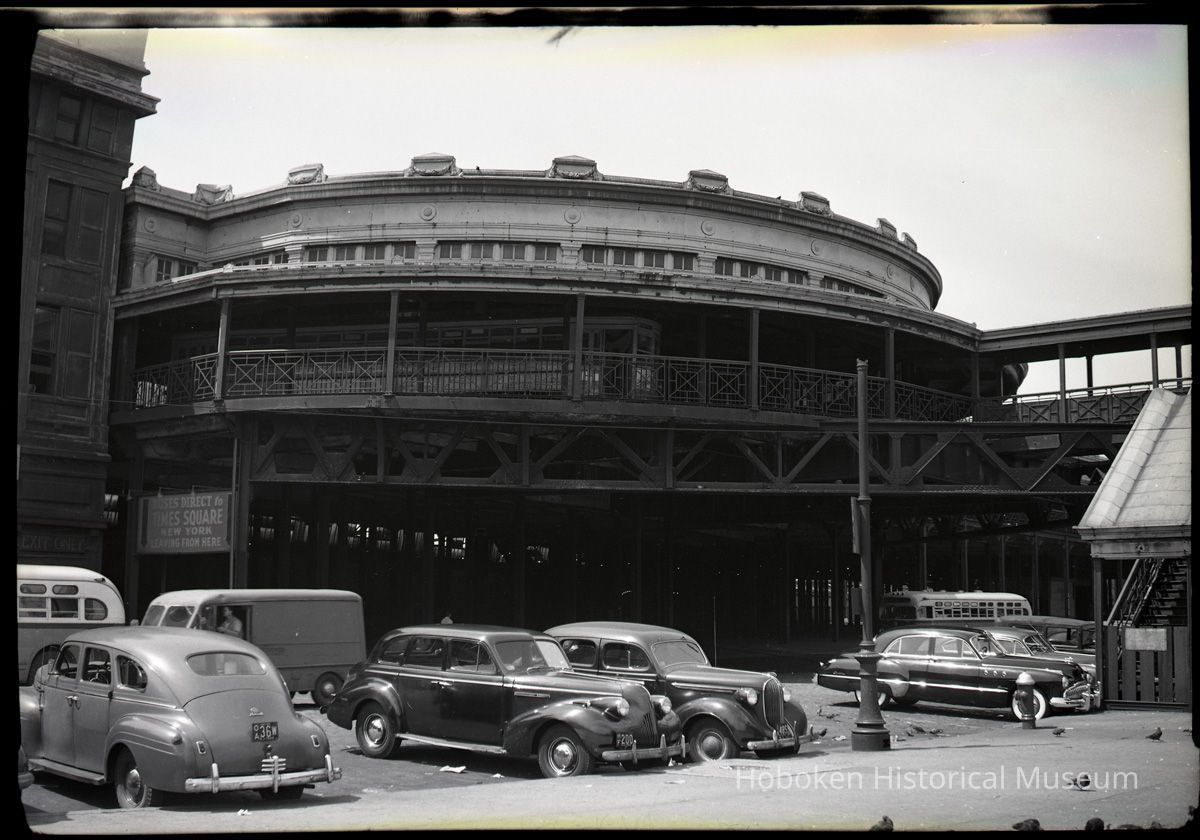 B+W photo negative of PSCT Hudson Place Terminal, Hudson Pl. & Lackawanna Plaza, Hoboken, n.d., ca. 1945.