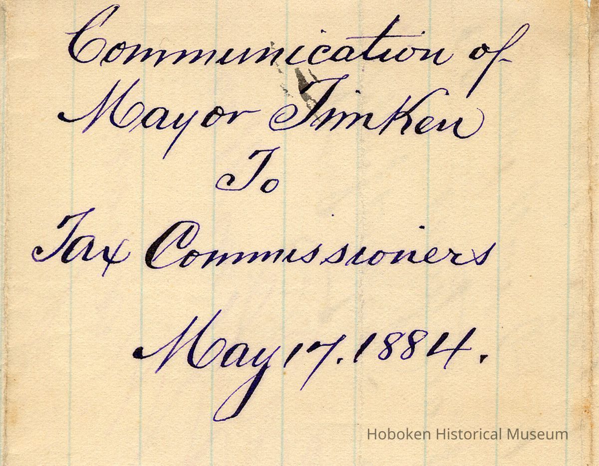 Notes: Archives 2012.004.0076 ==== Mayor's Office Hoboken, N.J. May 16th, 1884 To the Honorable the Board of Tax Commissioners of the City of Hoboken Gentlemen. Herewith I beg to submit to your Honorable Body, detailed statements of the amounts necessary, in my estimation, to carry on our city government. Any information which you should wish in regard thereto I will willingly furnish. I am at your service at all times. Yours Respectfully H.L. Timken Mayor ==== Communication of Mayor Timken To Tax Commissioners May 17, 1884 Status: OK Status By: dw Status Date: 2012-12-06
