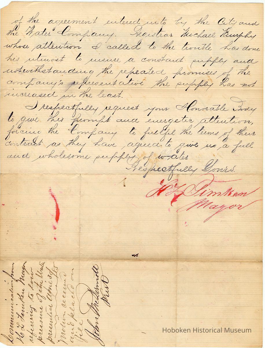 Notes: Archives 2012.004.0077 ==== Mayor's Office Hoboken, N.J. March 30th , 1885 To the Honorable the Board of Water Commissioners Gentlemen. Repeated complaints have been made to me regarding the insufficient water supply furnished by the Hackensack Water Co. I have not communicated with your Honorable Body before, as I communicated with Mr Chs [Charles] Brush, but as matters instead of improving grow worse, I am forced to ask you to take action in the matter. I shall only, as an instance relate my personal experience. The tenants in the fourth flats of my buildings, on River & Sixth Sts. have during the winter been without water during certain hours of the day, and this morning one of my tenants informs me that no water could be drawn at 8 o'clock A.M. The present tenants will move on May 1st principally on this account, and although I have had applications from parties willing to rent, the knowledge of the trouble with the water deters them. It is certainly a violation of the agreement entered into by the City and the Water Company. Registrar Michael Murphy whose attention I called to the trouble has done his utmost to insure a constant supply and not withstanding the repeated promises of the company's representative, the supply has not increased in the least. I respectfully request your Honorable Body to give this prompt and energetic attention, forcing the Company to fulfill the terms of their contract as they have agreed to give us, a full and wholesome supply of water. Respectfully Yours, H.L. Timken Mayor ==== Communication from HL Timken Mayor referring to low pressure of the water. Presented April 30/85 Motion received and placed on file John McDermott, Clerk ==== ==== Status: OK Status By: dw Status Date: 2012-12-06