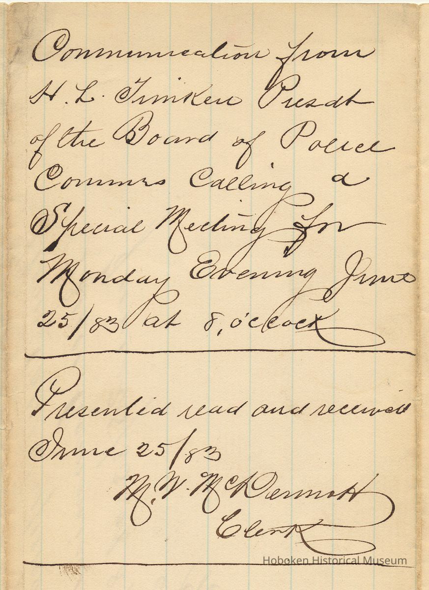 Notes: Archives 2012.004.0078 ==== Mayor's Office Hoboken, N.J. June 21st, 1883 To City Clerk Mr. McDermott Please call a special meeting of the Police Commissioners on Monday, June 25/83 at 8 p.m. By order of H.L. Timken Presdt of the Police Department Communication from H.L. Timken Pres't of the Board of Police Commissioners calling a Special Meeting for Monday Evening June 25/83 at 8 o'clock. Presented read and received June 25/83 M.V. McDermott Clerk Status: OK Status By: dw Status Date: 2012-12-06