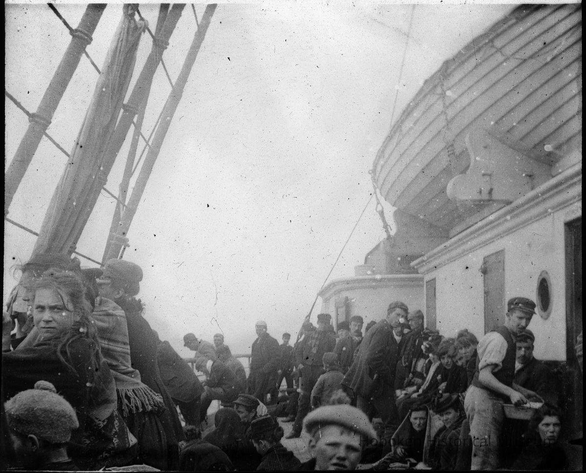 B+W lantern slide of Irish immigrants on deck of a ship, n.p. (U.K.), 1898.