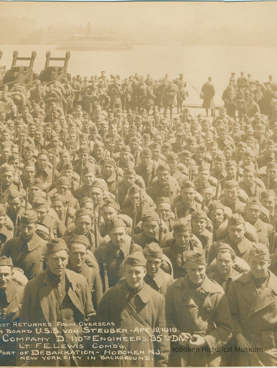 Caption reads: Just Returned from Overseas | On Board U.S.S. von Steuben Apr. 19, 1919 | Company D, 100th Engineers 35th Div. | Lt. F.E. Lewis Comd'g. | Port of Debarkation - Hoboken N.J. | New York City in background.