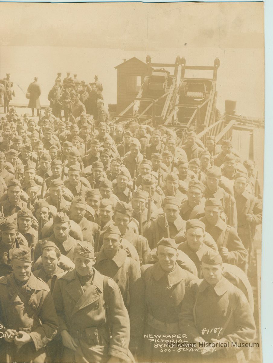 Sepia-tone group photo of returning Army troops on board the U.S.S. Von Steuben at the Port of Debarkation, Hoboken, April 19, 1919.