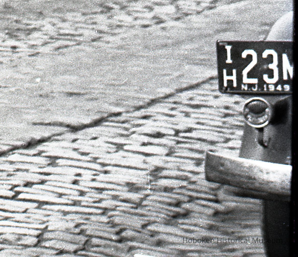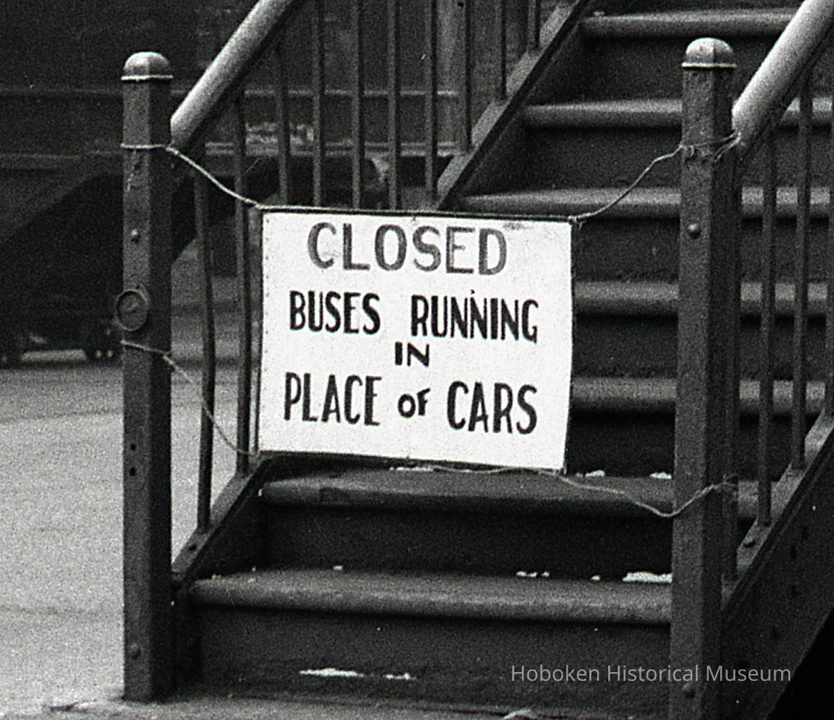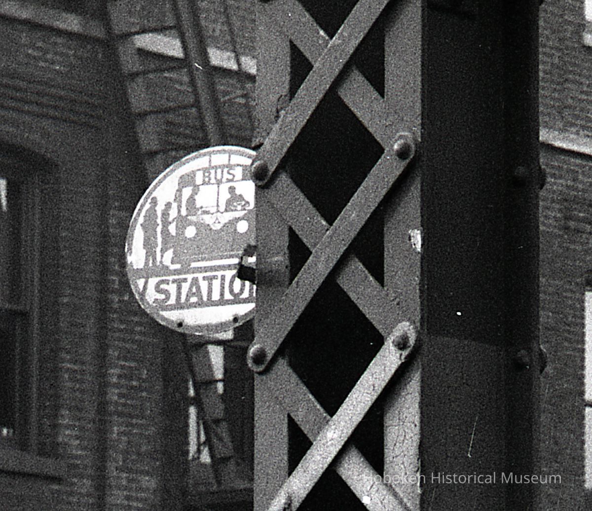B+W photo negative of PSCT bus station (stop) on Observer Highway at Bloomfield St., Hoboken, 1949.