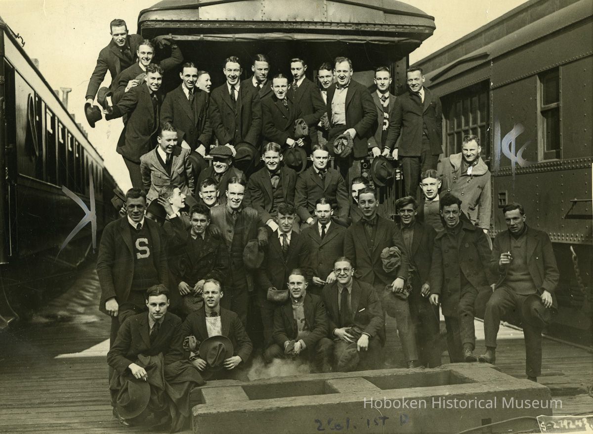 B+W photo of Stevens Institute of Technology students posed at passenger car at Lackawanna Terminal before leaving to break strike, Hoboken, Apr.14, 1920.