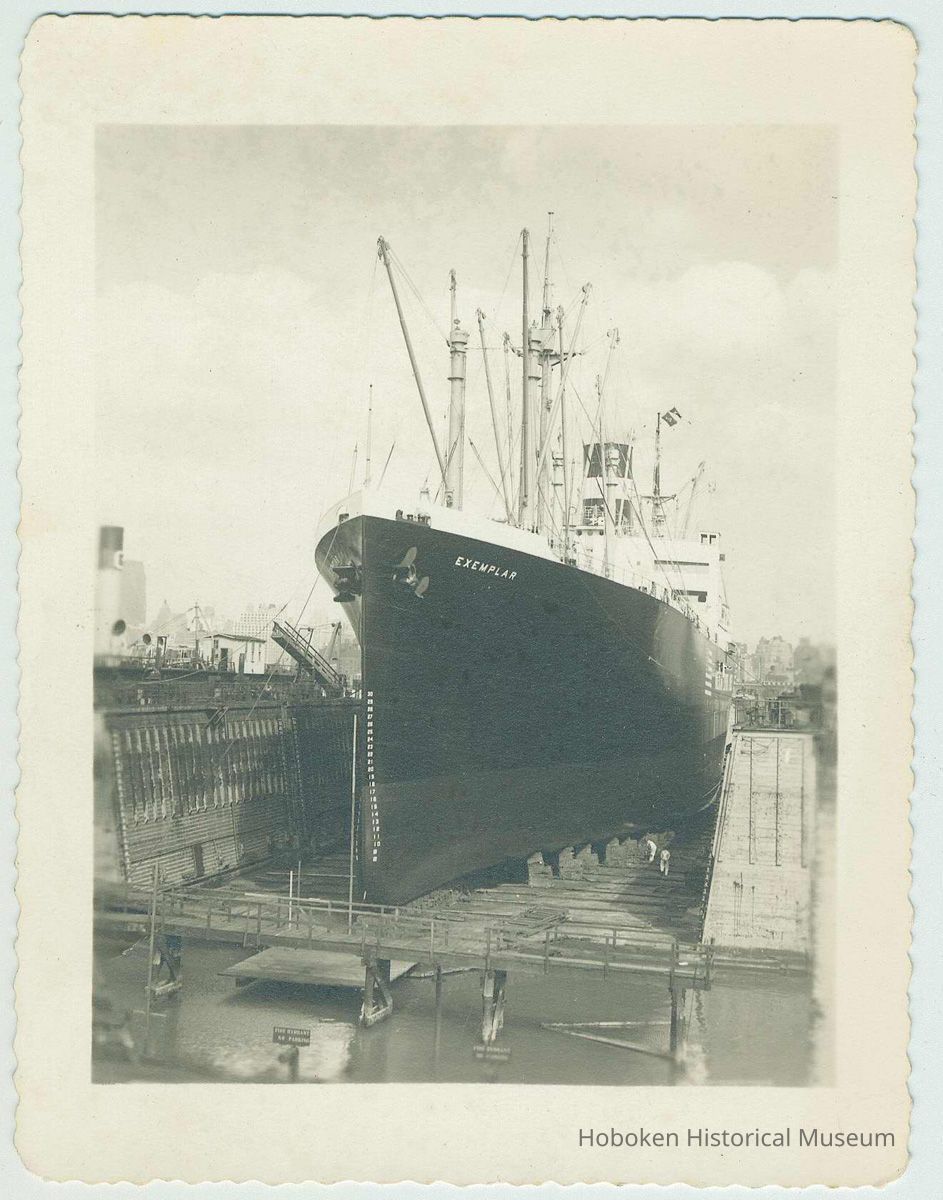 B+W photo of a port bow view of the S.S. Exemplar of the American Export Lines in dry dock (3 or 4?) at the Bethlehem Steel Shipyard, Hoboken Division