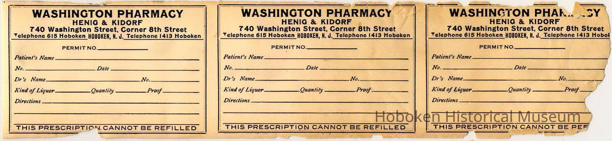 Blank printed container labels for liquor from Washington Pharmacy, 740 Washington Street, Hoboken, no date, ca. 1920-1933. 2-1/4" high x 3-7/16" wide (for single label). Uncut group of three, printed one side, gummed adhesive reverse. No perforations or cut line. Brittle and chipped.