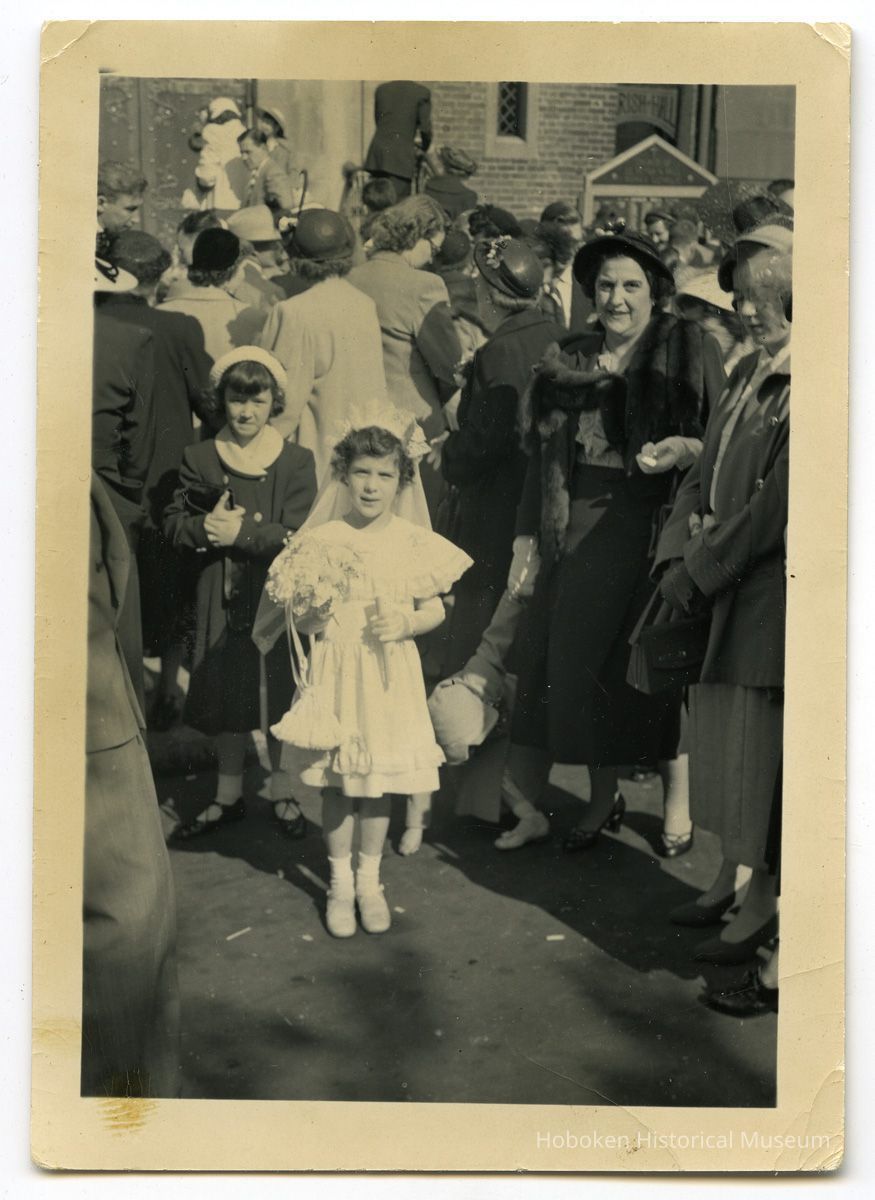 3: Mary Anne Amoroso in communion dress outside SS Peter & Paul Church, 1953, with her mother, Anne Amoroso, in dark dress and straw hat behind her to the right.