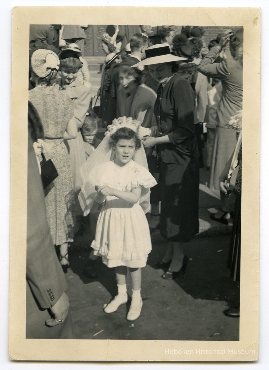Black-and-white photos, three, of Mary Anne Amoroso, Communion, Saints Peter & Paul Church, Hoboken, 1953.