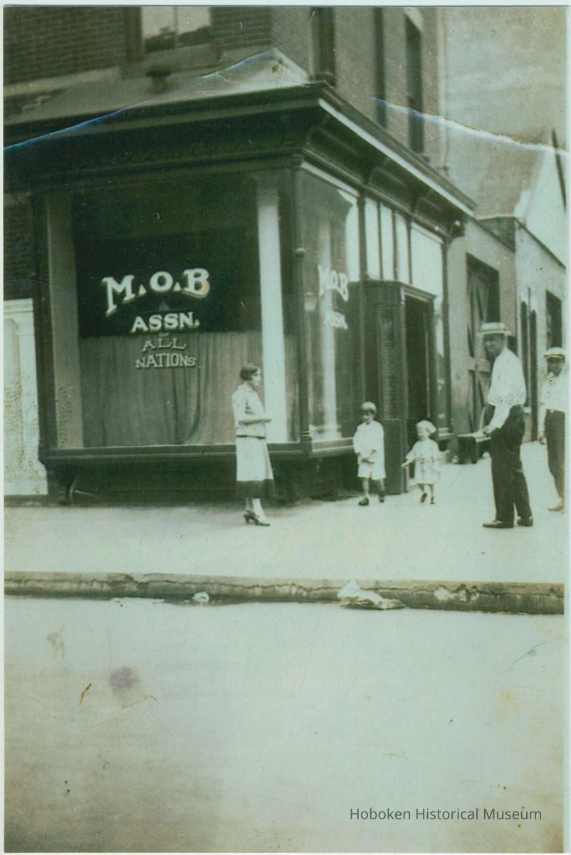 Color copy photo of a black-and-white photo of the Marty O'Brien Association (M.O.B. Assn. of All Nations), 333 Jefferson, corner of Fourth & Jefferson Sts., Hoboken, ca. 1927-1929.