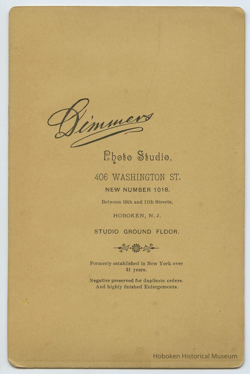 Theodore Dimmers was operating in Hoboken along with his brother, Rudolf (or Rudolph), at 406 Washington St. from the mid-to late 1880s (and which became 1018 Washington in 1892). Both addresses have been seen (using name of Dimmers or Dimmers Photo Studio) with text "Formerly in New York." Which of the two were the photographer for this sitting is unknown.