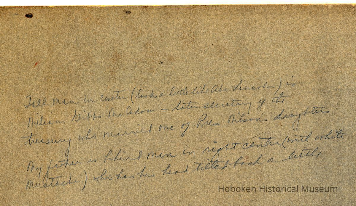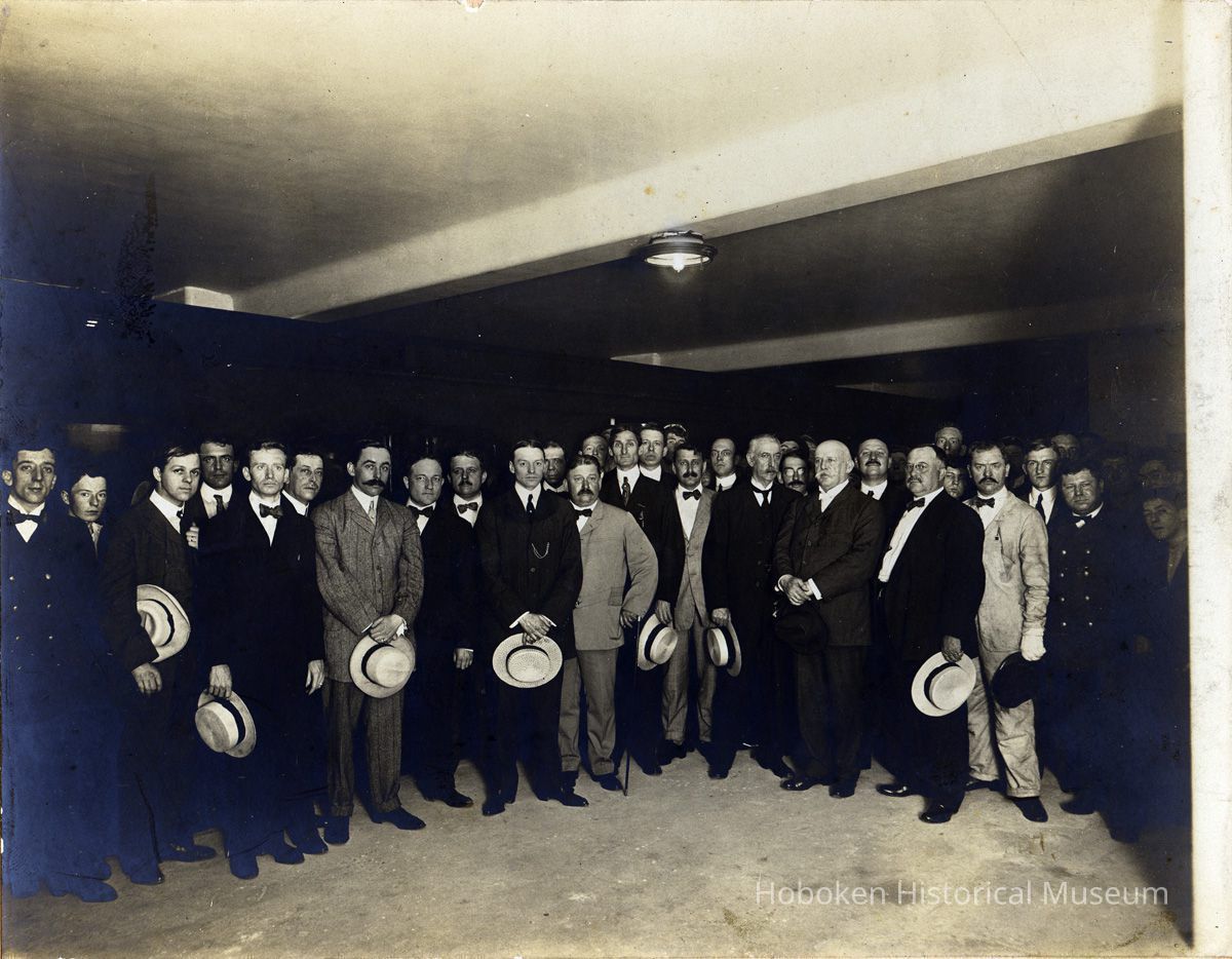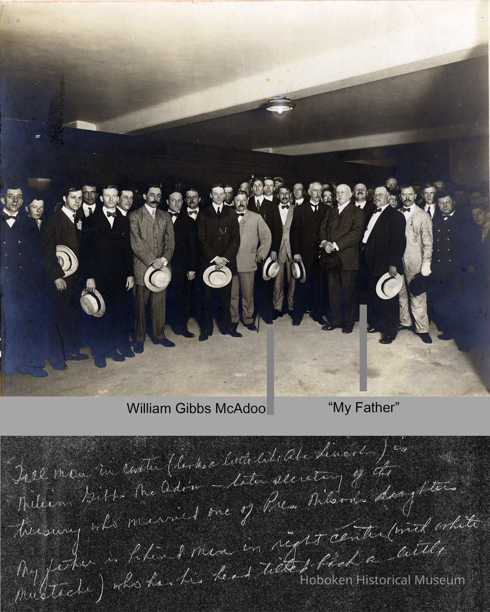 Notes: The Hudson and Manhattan Railroad inaugurated its first service on February 23, 1908 from Hoboken to 19th St. in New York. (Additional uptown service: 23rd St. started in June 1908; 33rd St, the uptown terminal, opened in November 1910.) The train trip commemorated in this photo was to the downtown terminal in New York at Church Street (also listed as Cordlandt Street) which became Hudson Terminal (erected by the Hudson & Manhattan over the downtown terminal and then the largest office building in New York City and later a major portion of the site of the World Trade Center.) Regular train service to downtown actually started on July 19, 1909. ---- McAdoo was Secretary of the Treasury from 1913-1918. He married Eleanor Randolph Wilson, daughter of President Woodrow Wilson, on May 7, 1914 at the White House. Original or Copy: Original Status: OK Status By: dw Status Date: 2014-08-09