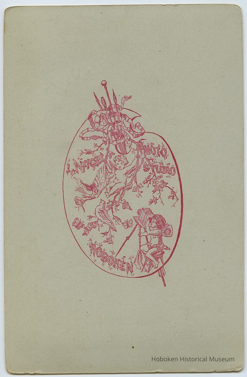 4-1/4" wide x 6-1/2" photographer's mount; gilt beveled edges. Photograph taken by L.[Louis] Nagel, 192 Washington St. (old street number prior to 1892; modern no. 508), Hoboken. Imprint is only on reverse.