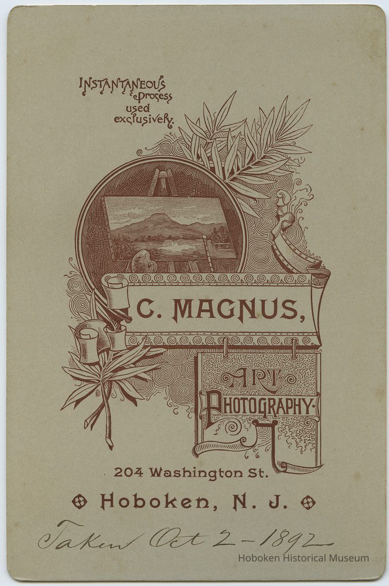 4-/14" wide x 6-1/2" high, beveled gilt edge. Photograph taken by C[onrad]. Magnus, 204 Washington St. (old number; after 1892, no. 520), Hoboken, N.J. Photographer's imprint below image and on back of mount. Reverse has contemporary holographic ink note: Taken Oct 2 - 1892.