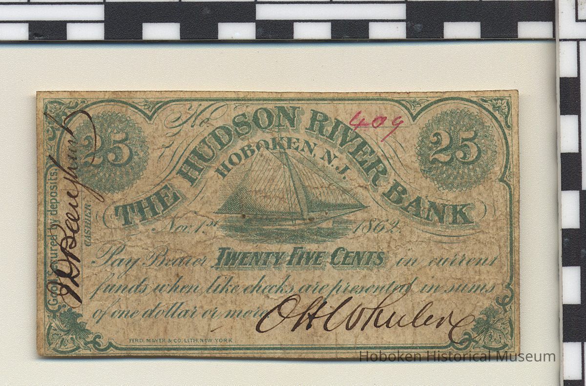 Paper money (fractional scrip): Twenty five cents. The Hudson River Bank, Hoboken, N.J. Nov. 1st 1862. No. 409.
