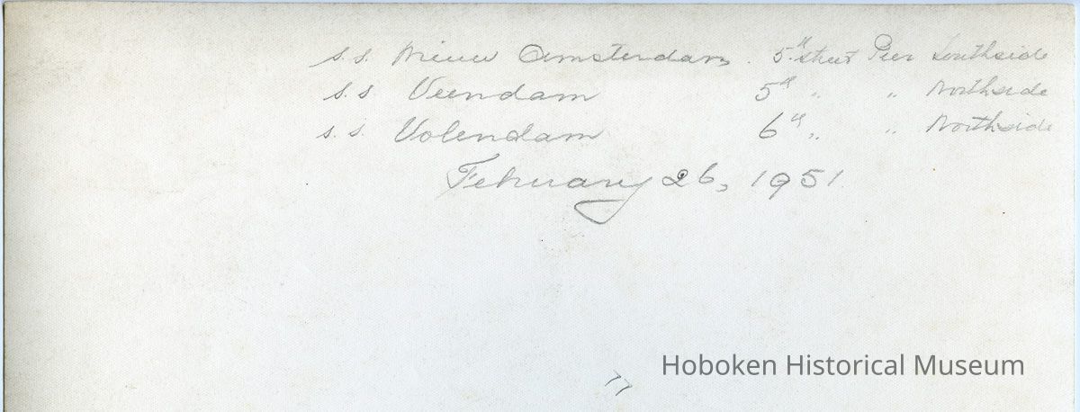 B+W photo of S.S. Nieuw Amsterdam, S.S. Veendam & S.S. Volendam docked at Holland America Line, 5th & 6th St. piers, Hoboken, Feb. 26, 1951.