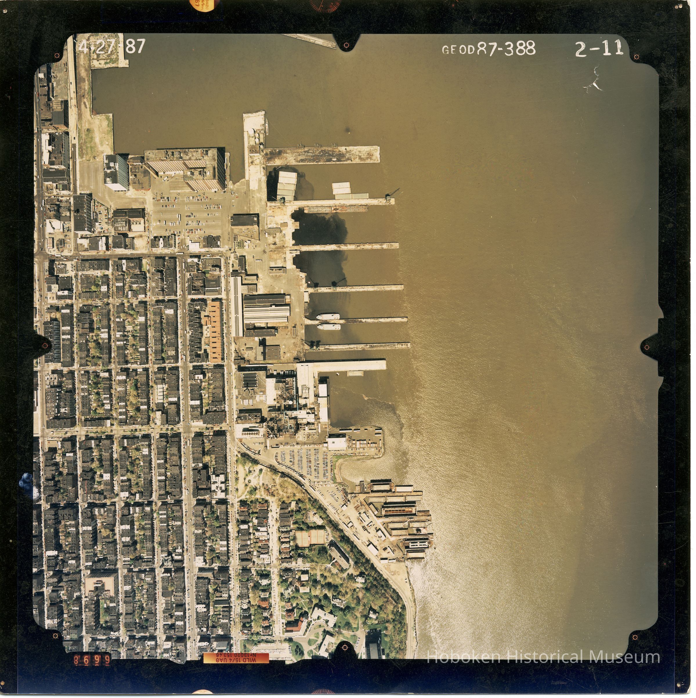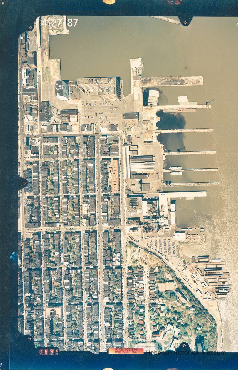 Color aerial photo of the northeast quadrant of Hoboken including the northern waterfront, April 27, 1987.
