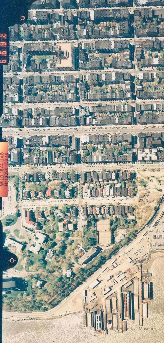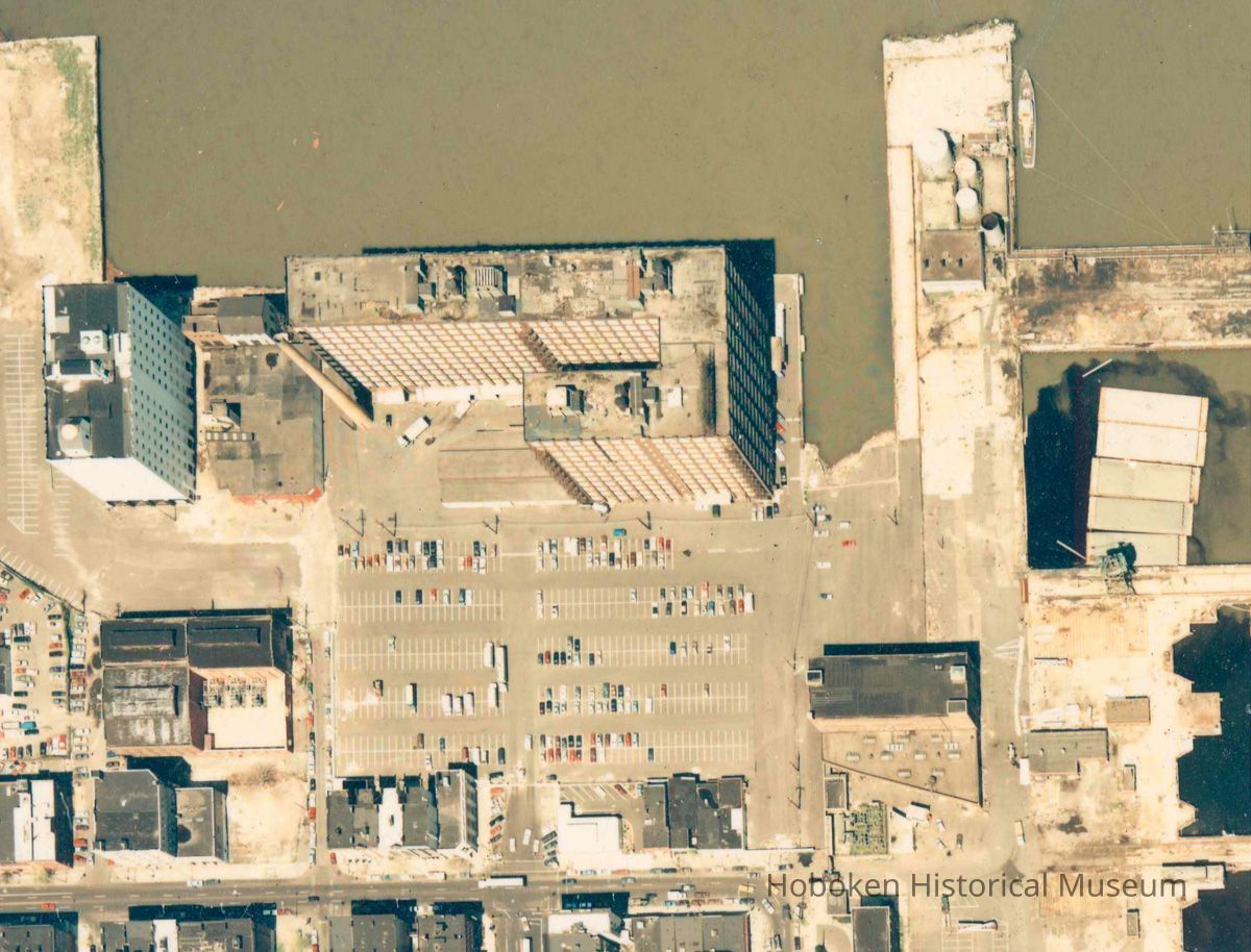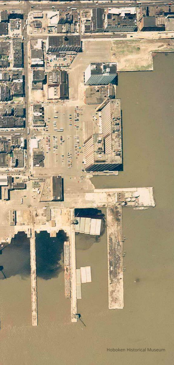 Using lettering on image as the top, the view is looking northeast. The view includes Stevens Institute of Technology, Union Dry Dock Co., Maxwell House Coffee plant, Elysian Park, the former Bethlehem Steel Shipyard site, Lipton Tea building and Weekhawken Cove,