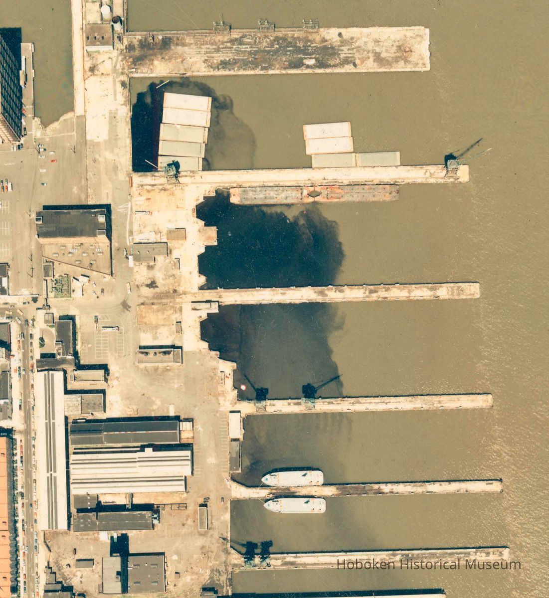 The photo was believed to be commissioned as documentation of an environmental pollution situation. Note the dark plumes in the water between Shipyard piers from 12th to15th Streets. Firm that produced the image is not known. See related. Images of group available on one CD in TIFF, JPEG and PDF.
