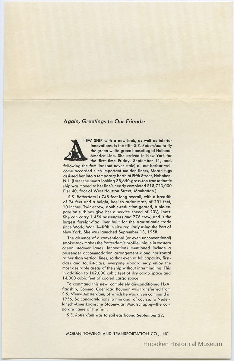 Notes: Photos 2014.046.0311 Text of presentation leaf ==== Again, Greetings to Our Friends: NEW SHIP with a new look, as well as interior innovations, is the fifth S.S. Rotterdam to fly the green-white-green houseflag of Holland-America Line. She arrived in New York for the first time Friday, September 11, and, following the familiar (but never stale) all-out harbor welcome accorded such important maiden liners, Moran tugs assisted her into a temporary berth at Fifth Street, Hoboken, N.J. (Later the smart looking 38,650-gross-ton transatlantic ship was moved to her line’s nearly completed $18,723,000 Pier 40, foot of West Houston Street, Manhattan.) 5.5. Rotterdam is 748 feet long overall, with a breadth of 94 feet and a height, keel to radar mast, of 201 feet, 10 inches. Twin-screw, double-reduction-geared, triple-expansion turbines give her a service speed of 20 1/2 knots. She can carry 1,456 passengers and 776 crew, and is the largest foreign-flag liner built for the transatlantic trade since World War II—fifth in size regularly using the Port of New York. She was launched September 13, 1958. The absence of a conventional (or even unconventional) smokestack makes the Rotterdam's profile unique in western ocean steamer lanes. Innovations mentioned include a passenger accommodation arrangement along horizontal rather than vertical lines, so that even at full capacity, first-class and tourist-class, everyone aboard may enjoy the most desirable areas of the ship without intermingling. This in addition to 102,000 cubic feet of dry cargo space and 14,000 cubic feet of cooled cargo space. To command this new, completely air-conditioned H.-A. flagship, Commo. Coenraad Bouman was transferred from S.S. Nieuw Amsterdam, of which he was given command in 1956. So congratulations to him and, of course, to Nederlansch-Amerikaansche Stoomvaart Maatschappij—the corporate name of the firm. S.S. Rotterdam was to sail eastbound September 22. MORAN TOWING AND TRANSPORTATION CO., INC. ==== ==== Original or Copy: Original Status: OK Status By: dw Status Date: 2014-09-03